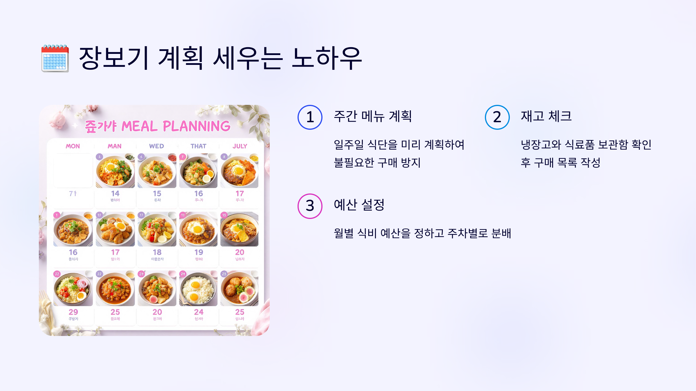 계절별 장보기 전략도 중요해요. 김장철인 11월에는 배추와 무 가격이 오르기 때문에 10월 말에 미리 구매하는 것이 현명하고, 명절 전에는 선물세트나 제수용품 가격이 오르니 2-3주 전에 미리 준비하는 것이 좋답니다. 여름철에는 에어컨 사용으로 전기료 부담이 크니 전기를 적게 쓰는 조리법의 식재료를 중심으로 구매하는 것도 절약 팁이에요! 🌞