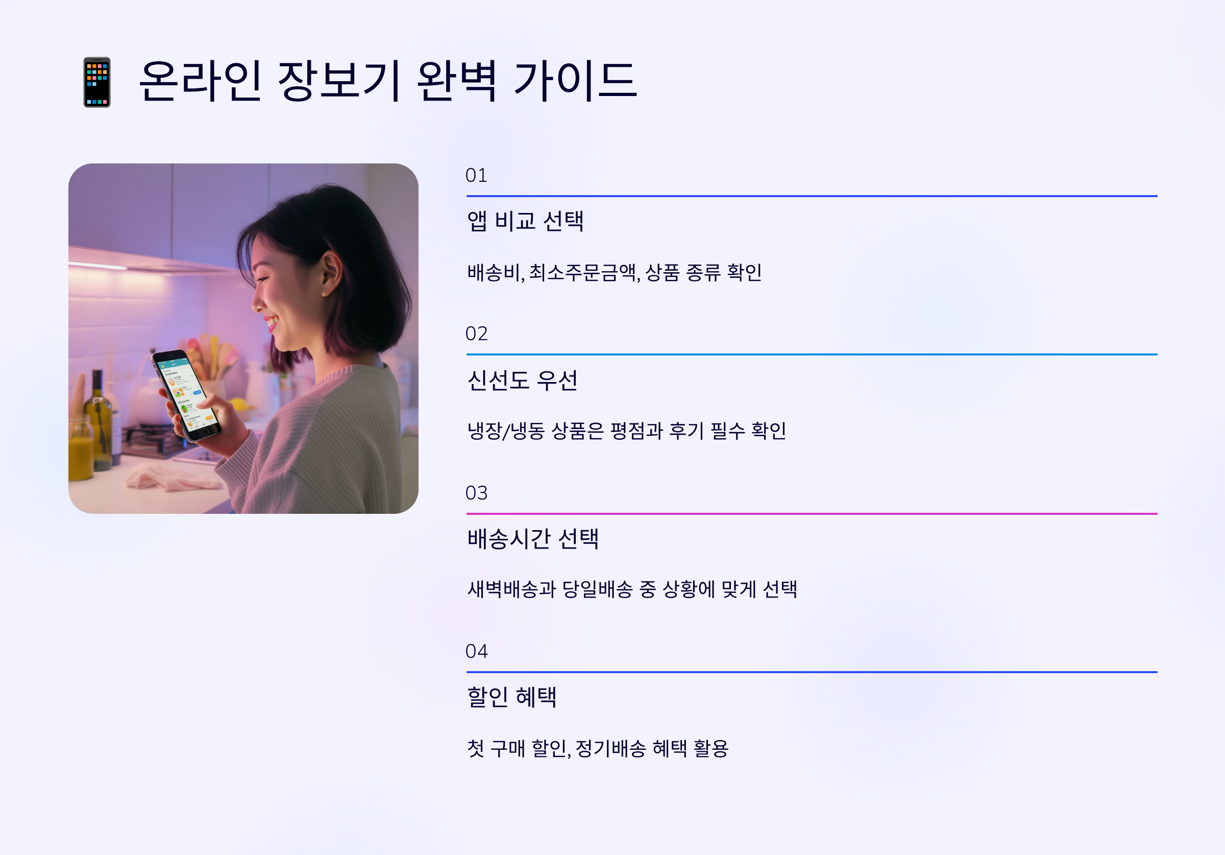온라인 장보기는 시간과 체력을 절약할 수 있는 효율적인 방법이에요. 쿠팡, 마켓컬리, SSG, 네이버 장보기 등 다양한 플랫폼이 있는데, 각각의 특징을 파악하고 상황에 맞게 활용하는 것이 중요해요. 쿠팡은 로켓배송으로 당일이나 익일 배송이 가능하고, 마켓컬리는 프리미엄 식재료가 강점이에요.