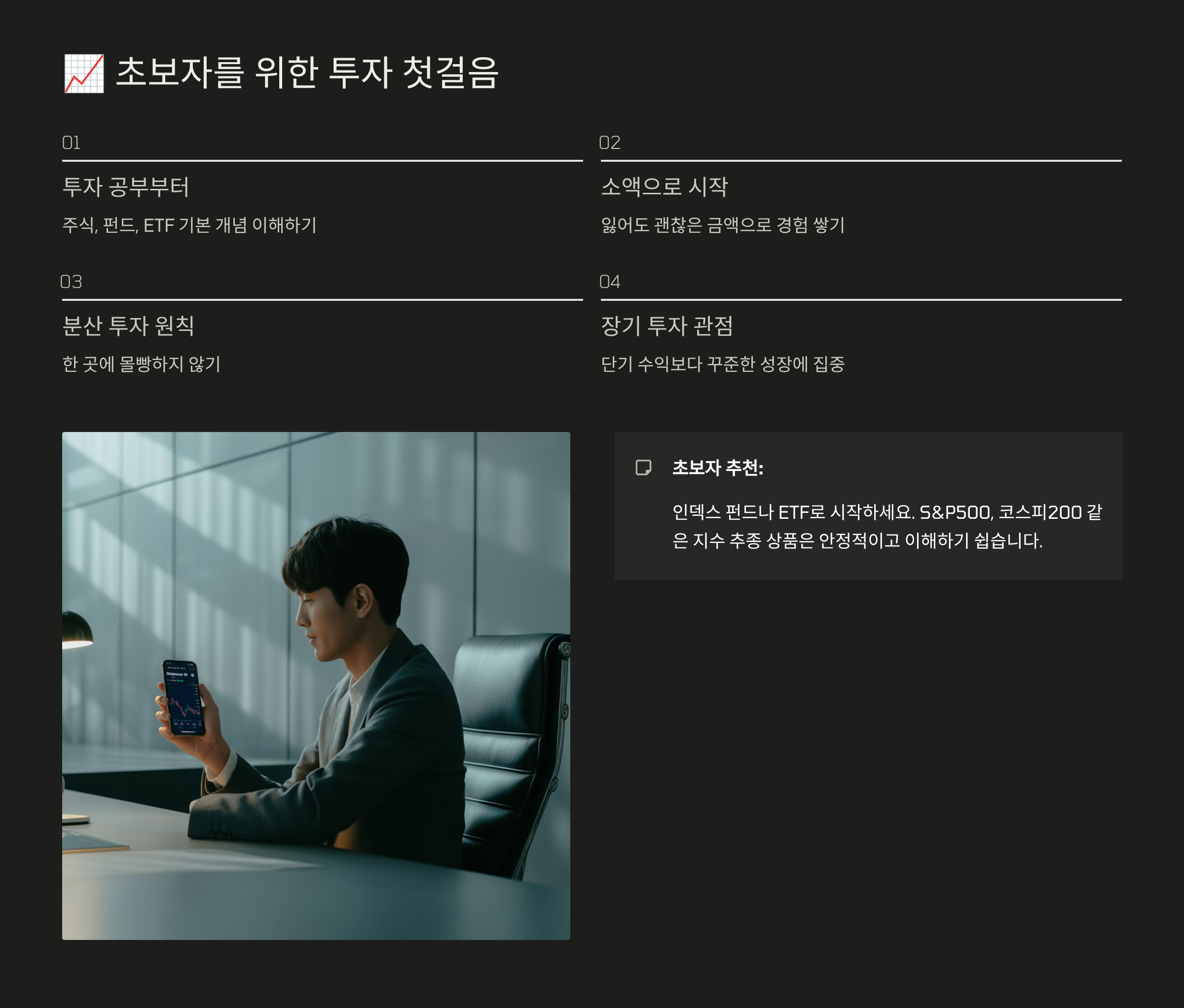 투자는 재테크의 꽃이라고 할 수 있어요. 하지만 많은 초보자들이 투자를 도박처럼 생각하거나 너무 어렵게 느껴서 시작조차 못하는 경우가 많아요. 투자는 공부하고 준비하면 누구나 할 수 있는 영역이에요. 적은 금액부터 차근차근 시작해 보는 게 중요해요.