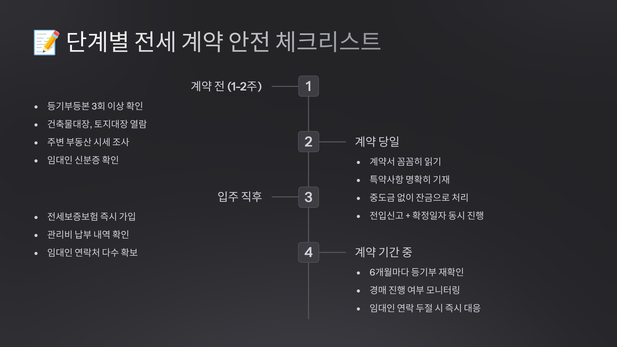 다음 섹션에서는 전세 계약 시 단계별로 확인해야 할 체크리스트를 정리해 드릴게요. 이 체크리스트만 따라 하면 전세 사기 위험을 크게 줄일 수 있어요.