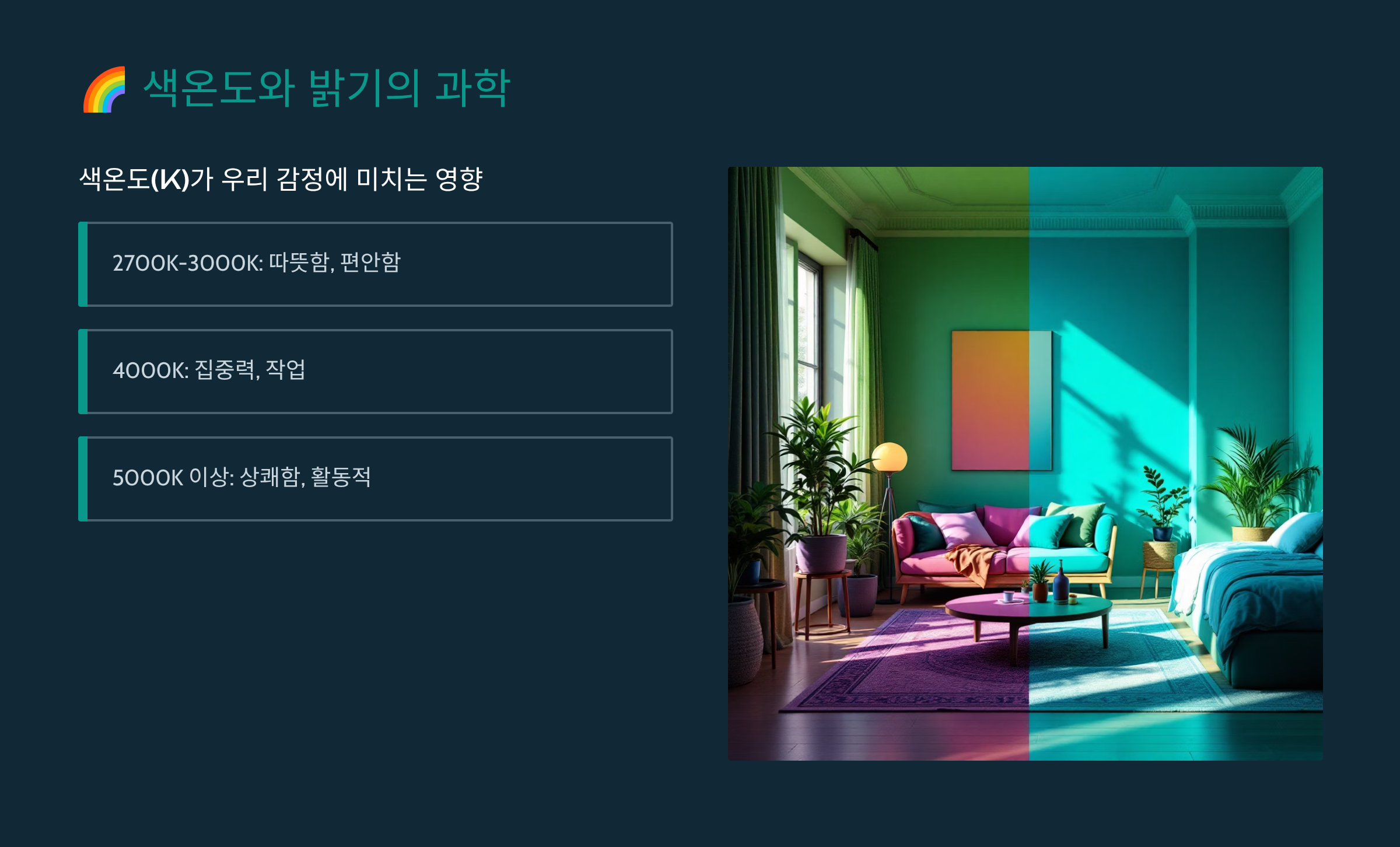 | 저녁 (18-22시) | 3000-4000K | 중간 | 편안한 활동 |