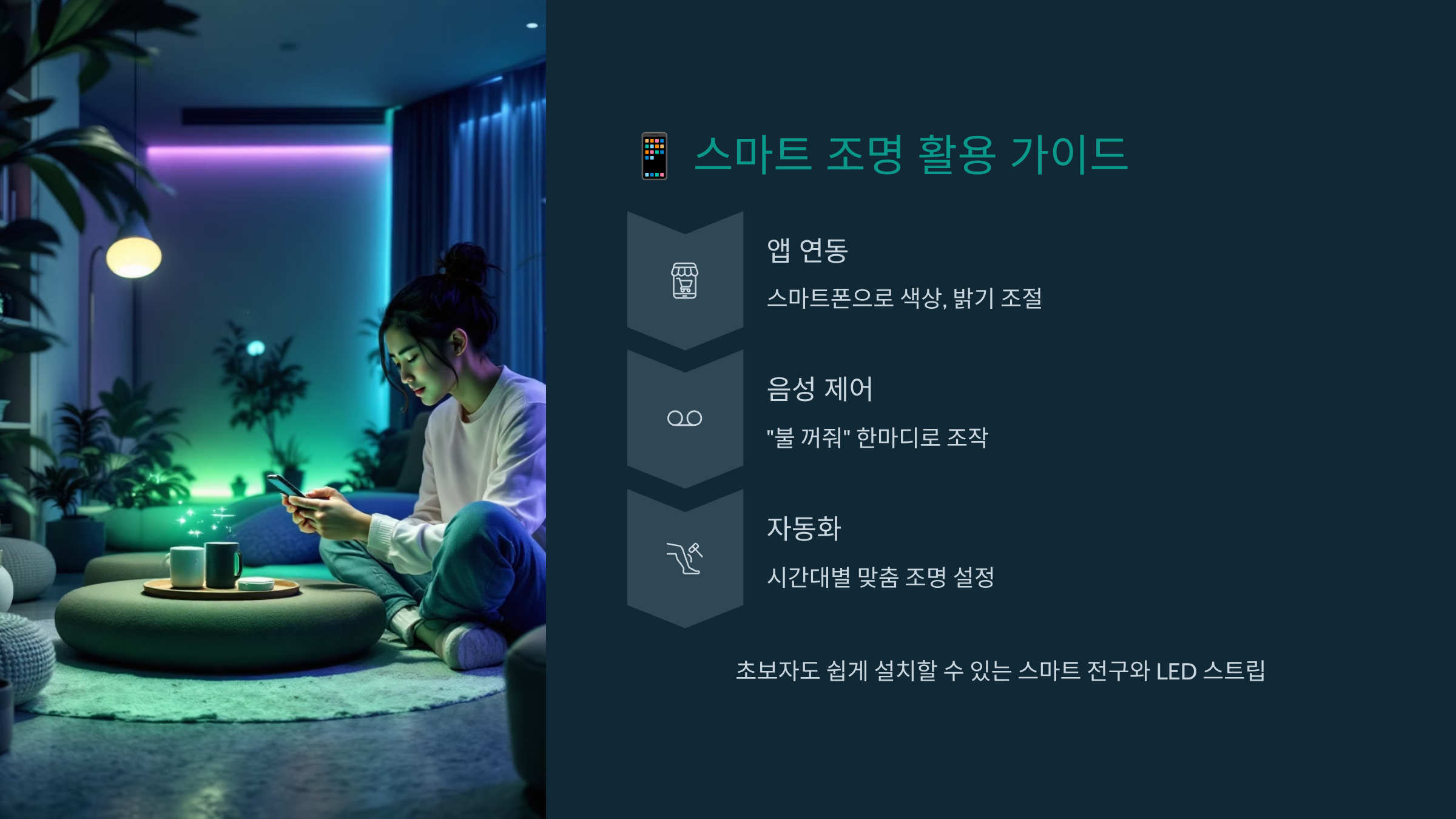 스마트 조명은 IoT 시대의 혁신적인 설루션이에요. 스마트폰 앱으로 조명을 제어하고, 음성 명령으로 켜고 끄며, 일정에 따라 자동으로 작동하게 할 수 있답니다. 필립스 휴, 샤오미 이라이트, LG 씽큐 등 다양한 브랜드가 있는데, 각각 특징이 달라요. 필립스 휴는 생태계가 가장 넓고, 샤오미는 가성비가 뛰어나며, LG는 국내 서비스가 안정적이에요.