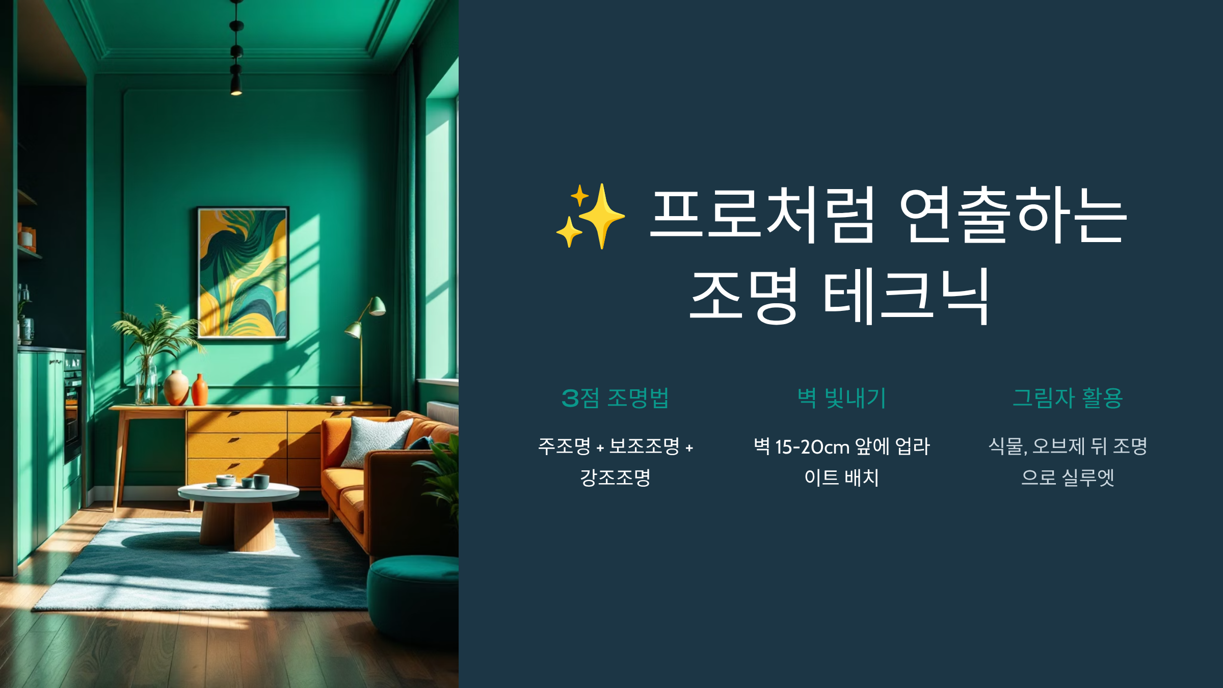 빛의 방향성도 중요한 요소예요. 직접 조명은 특정 영역을 밝게 비추지만 그림자가 강하게 생기고, 간접 조명은 부드럽고 균일한 빛을 만들어내죠. 천장을 향해 빛을 쏘는 업라이팅은 공간을 넓어 보이게 하고, 아래로 향하는 다운라이팅은 아늑한 분위기를 연출해요. 벽을 따라 빛을 비추는 월워싱 기법은 공간에 깊이감을 더해준답니다.