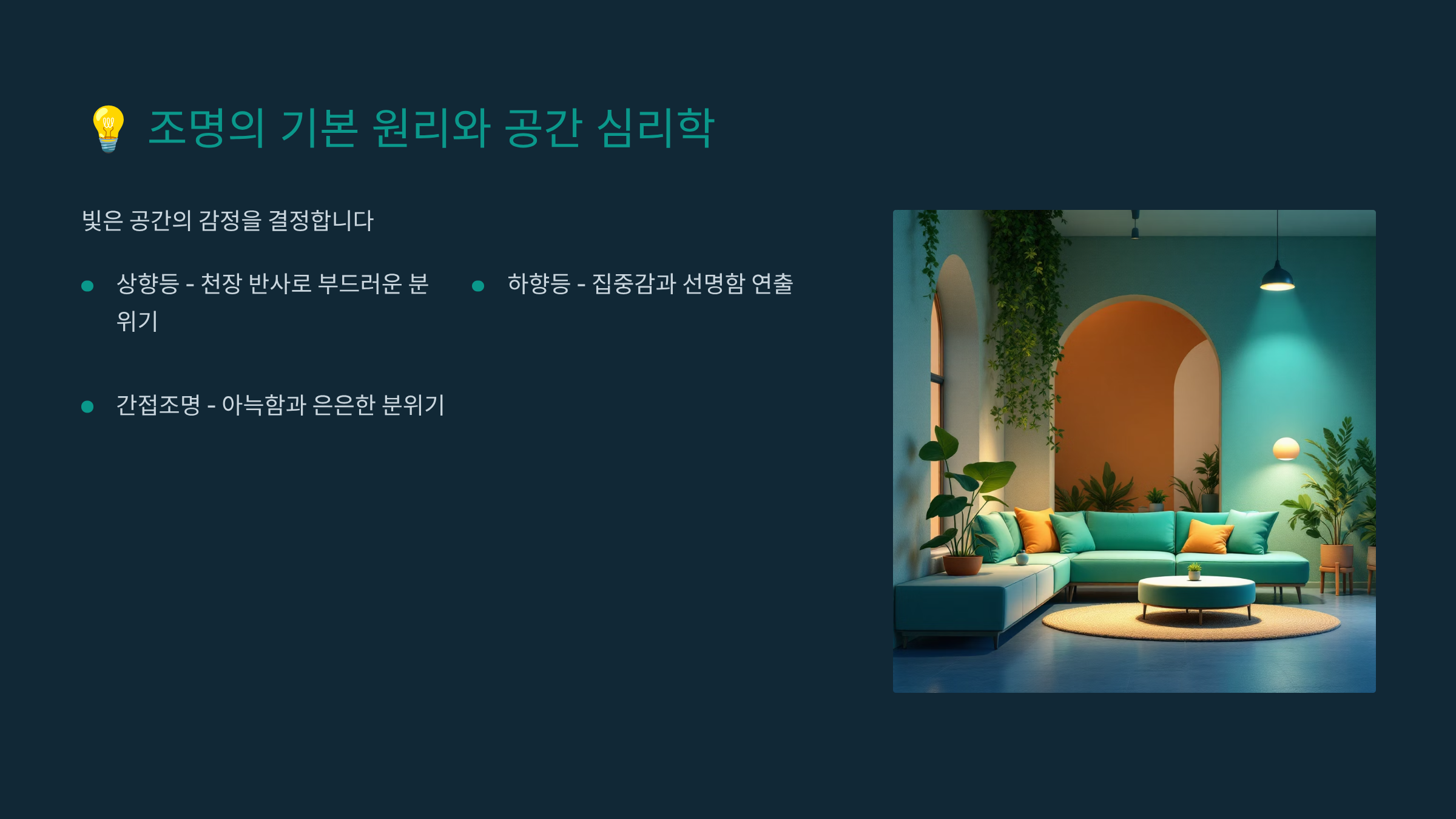 조명이 우리 감정과 행동에 미치는 영향은 생각보다 훨씬 크답니다. 빛의 과학을 이해하면 원하는 분위기를 자유자재로 연출할 수 있어요. 조명 심리학 연구에 따르면, 따뜻한 빛은 편안함과 친밀감을 높이고, 차가운 빛은 집중력과 생산성을 향상한다고 해요. 이런 원리를 알고 활용하면 공간의 목적에 맞는 완벽한 조명을 선택할 수 있답니다.