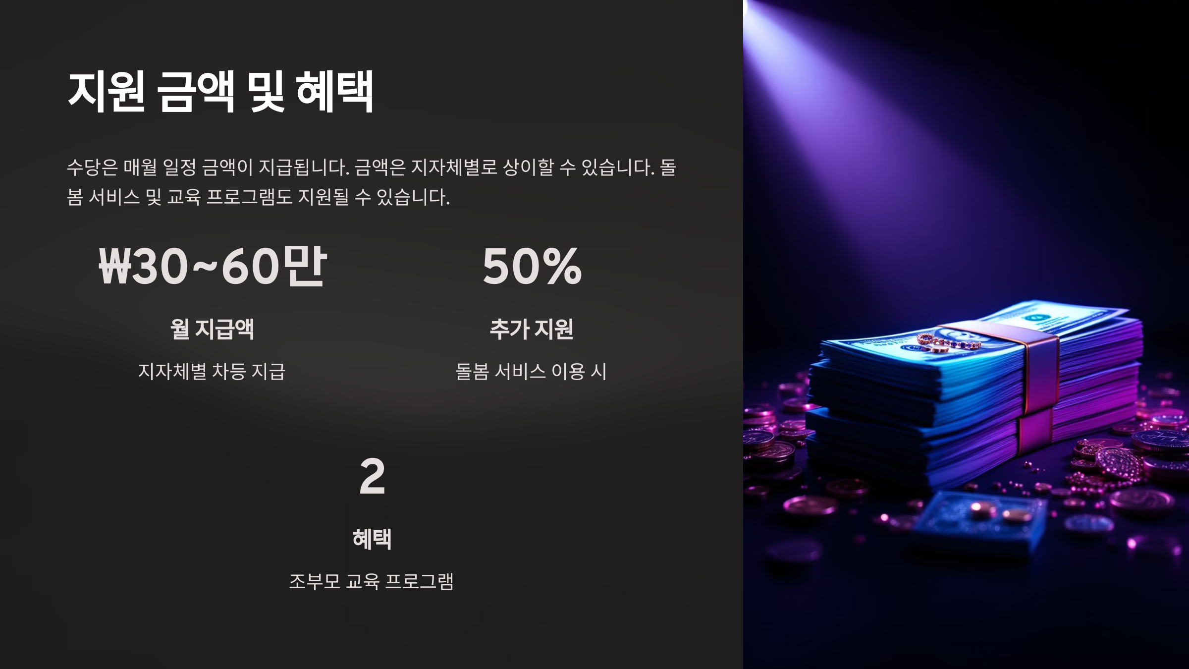 지자체에 따라 별도로 조부모 돌봄 수당을 지급하는 곳도 있으니, 해당 지역에서 시행하는 정책을 확인하는 것이 좋아요.