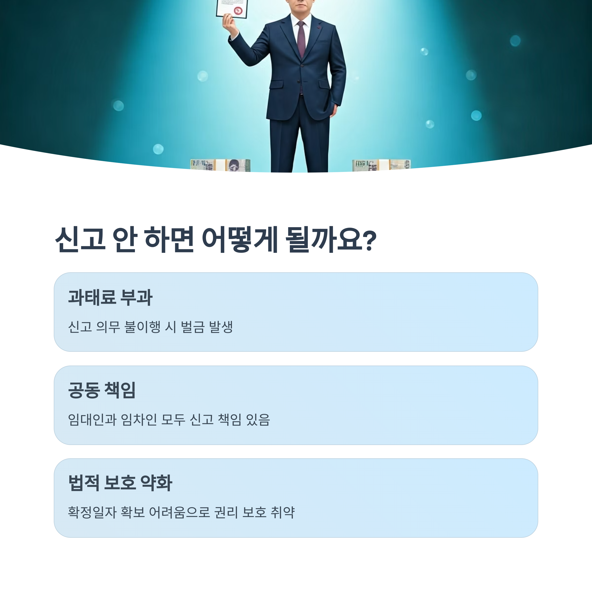 신고를 하지 않으면 과태료가 부과될 수 있어요. 계약 체결일로부터 30일을 넘기면 최대 30만 원까지 부과될 수 있으니 유의해야 해요.