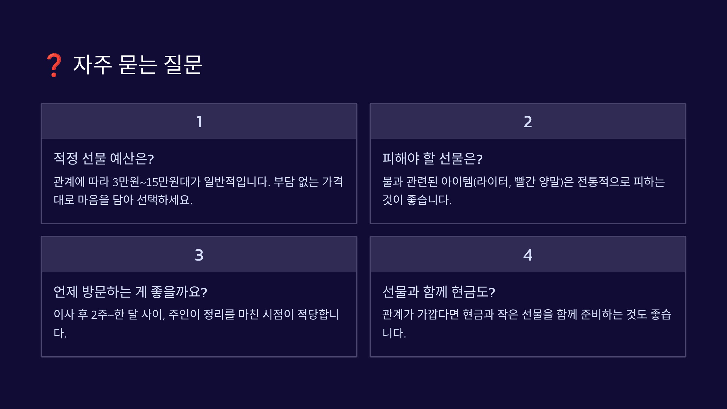 A29. 첫 번째 집들이에만 선물을 준비하는 게 일반적이에요. 두 번째부터는 간단한 먹거리나 꽃 정도만 준비해도 충분해요. 부담 갖지 말고 편하게 방문하세요.