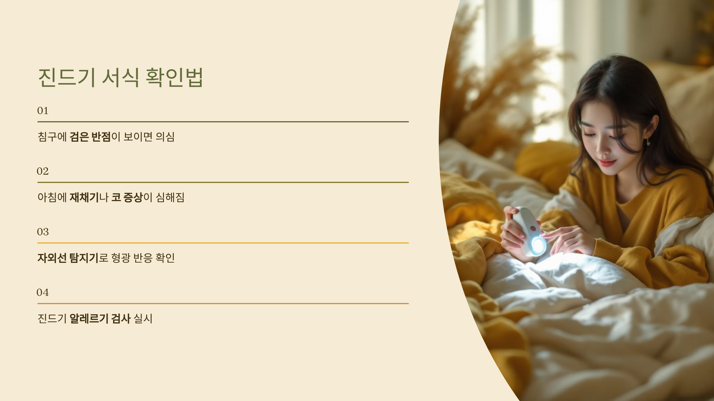 집에 진드기가 많이 서식하고 있는지 확인하는 방법은 여러 가지가 있어요. 육안으로는 보이지 않지만, 몇 가지 징후를 통해 진드기의 존재를 파악할 수 있답니다. 가족 중 누군가가 아침마다 재채기를 하거나 눈이 가렵다고 호소한다면, 진드기가 원인일 가능성이 높아요. 특히 침실에서 증상이 심하다면 거의 확실하다고 볼 수 있죠! 🕵️