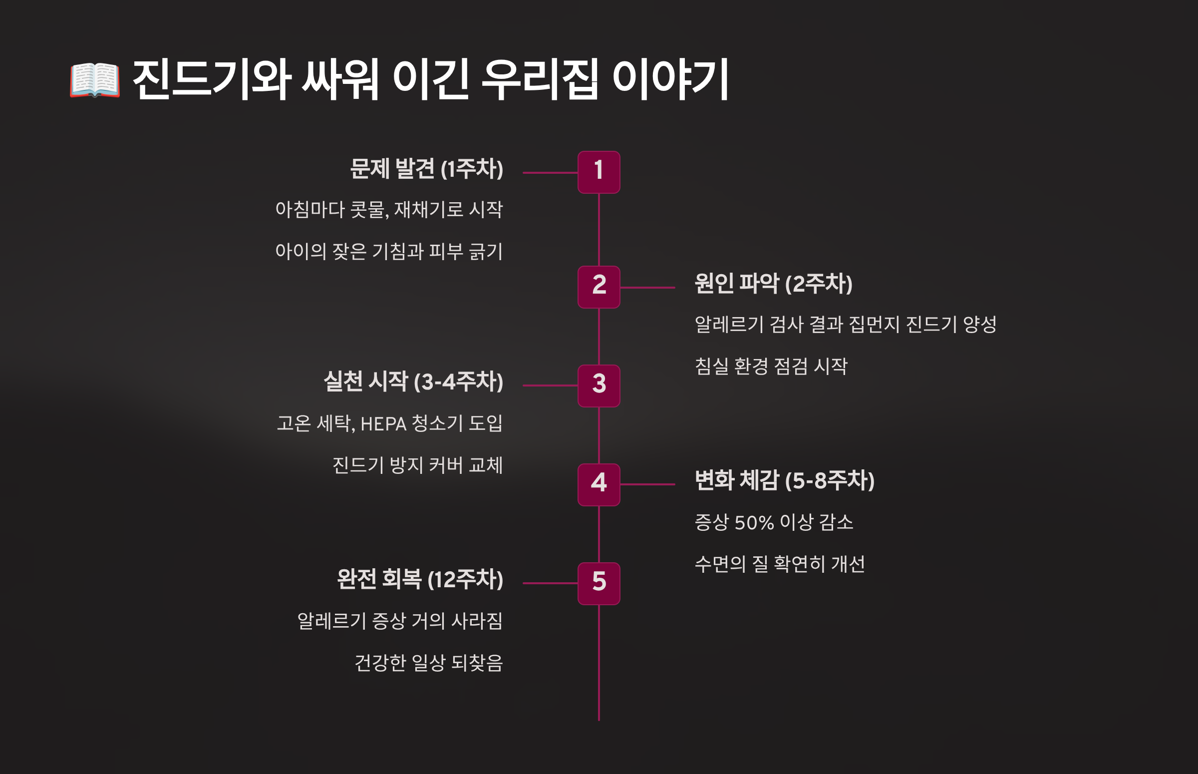 전주의 임재현 씨(33세)는 만성 피로에 시달렸어요. 병원 검사에서도 특별한 이상이 없었는데, 알고 보니 진드기 알레르기 때문이었죠. 침실을 완전히 리모델링하고 진드기 퇴치에 올인했어요. 3개월 후 활력이 돌아왔고, 업무 효율도 2배로 늘었대요. 연봉 협상에서도 좋은 결과를 얻었다고 하네요! 건강이 곧 경쟁력이라는 걸 깨달았대요 💪