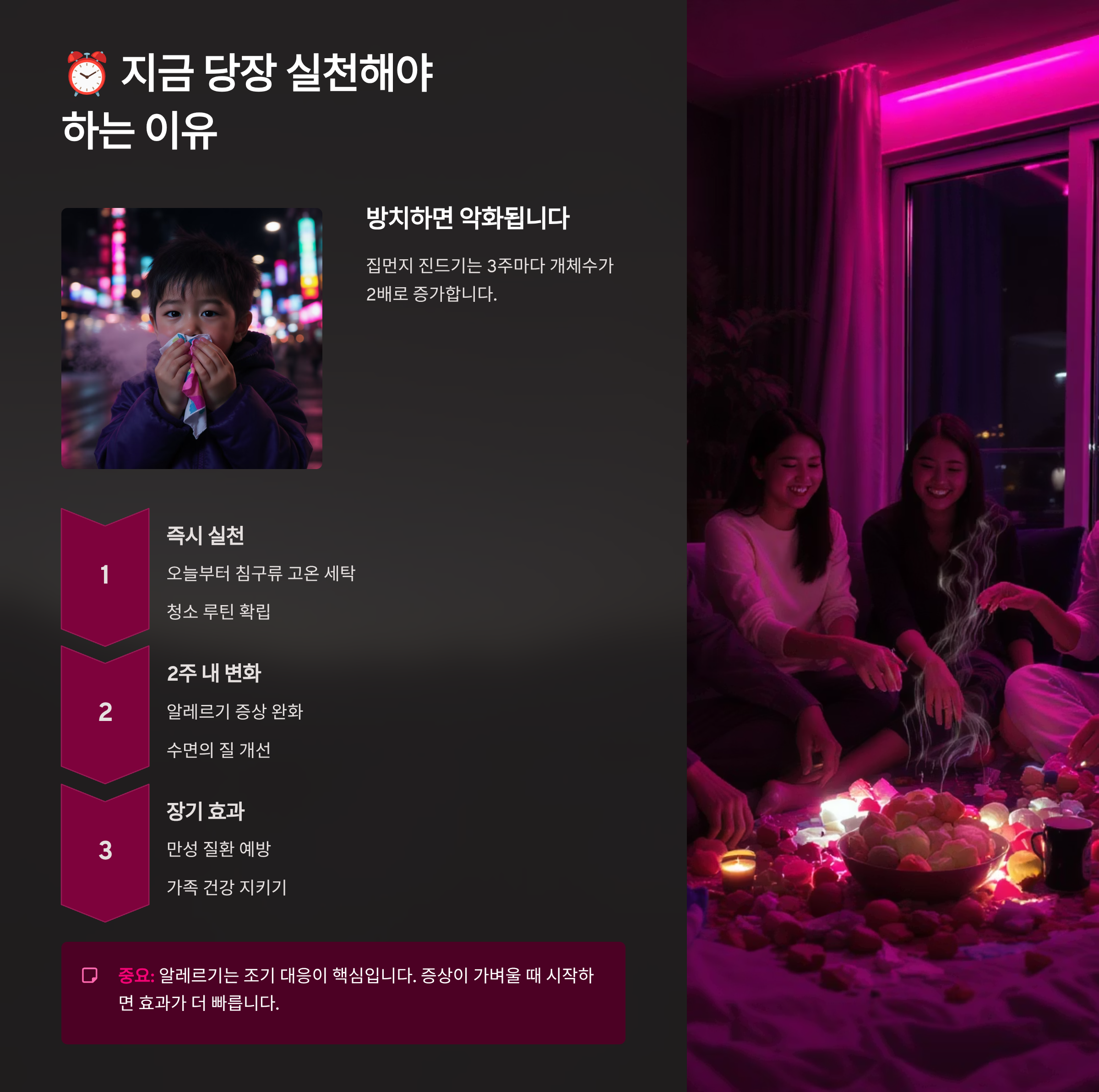 알레르기 증상은 누적돼요. 처음엔 가벼운 재채기로 시작하지만, 방치하면 만성 비염, 천식으로 발전할 수 있죠. 특히 어린이의 경우 한 번 생긴 알레르기는 평생 갈 수 있어요. 지금 당장 조치를 취하지 않으면 아이의 미래 건강을 위협하는 시한폭탄을 안고 사는 셈이에요.