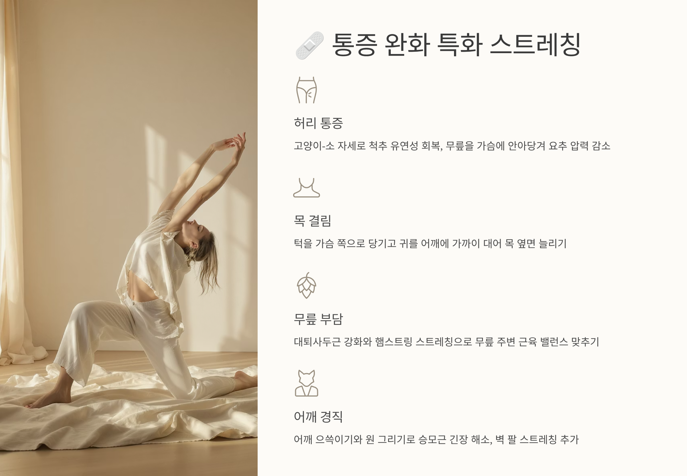 | 통증 부위 | 추천 스트레칭 | 주의사항 |