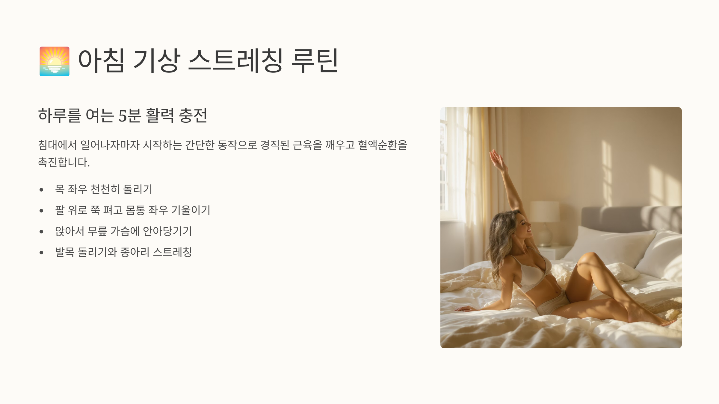 호흡과 함께 하는 스트레칭이 더욱 효과적이에요. 근육을 늘릴 때는 숨을 내쉬고, 원위치로 돌아올 때는 들이마시세요. 이렇게 하면 근육이 더 잘 이완되고 스트레칭 효과가 배가 된답니다. 아침 스트레칭으로 활기찬 하루를 시작해 보세요! 💪