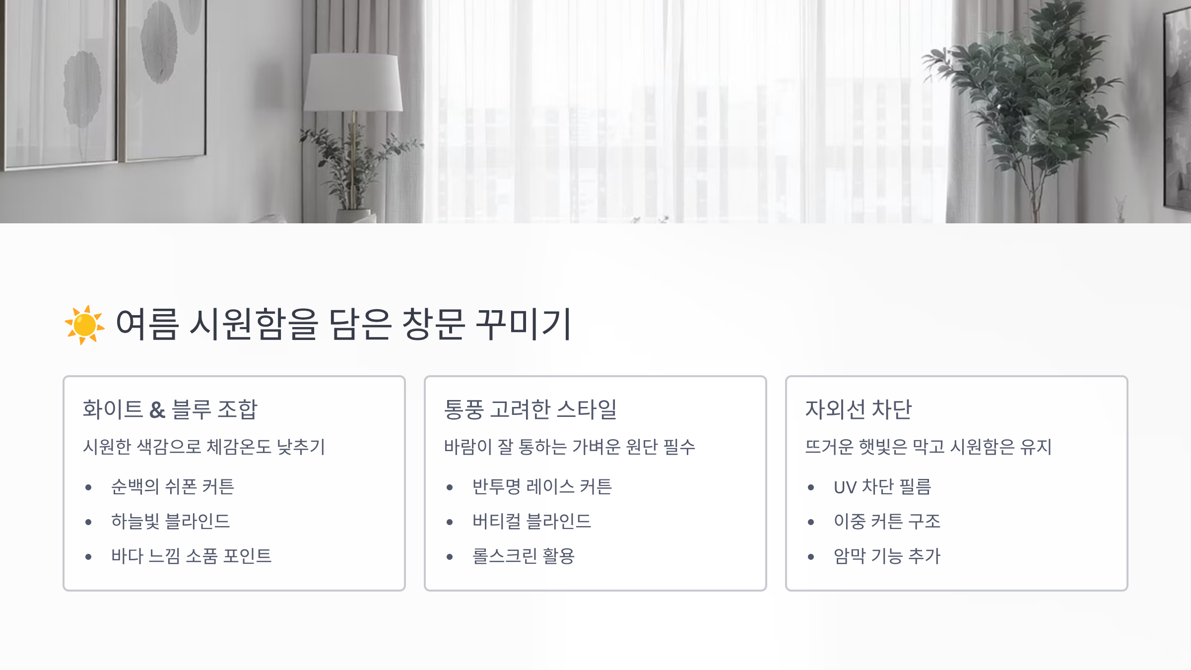 이 글에서 제공하는 정보는 일반적인 창문 인테리어 가이드이며, 개인의 취향과 공간 특성에 따라 결과가 다를 수 있습니다. 전문적인 인테리어 시공이 필요한 경우 전문가와 상담하시기 바랍니다.