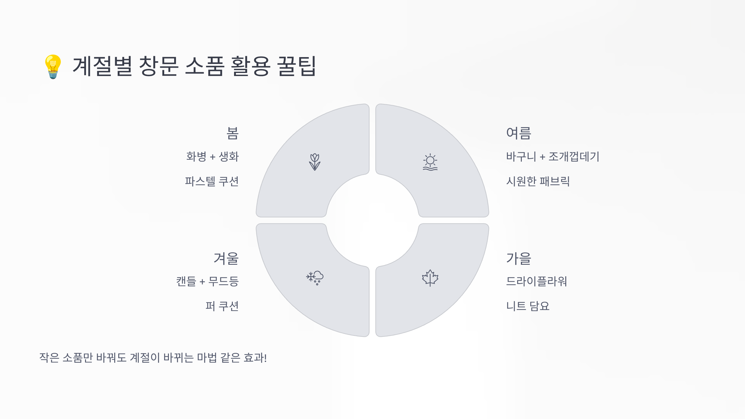 계절별 창문 인테리어를 더욱 효과적으로 하려면 소품 활용이 중요해요. 비싼 가구나 대대적인 리모델링 없이도 작은 소품 하나로 큰 변화를 만들 수 있답니다. 계절마다 바꿔주는 소품들은 보관도 쉽고 재사용도 가능해서 경제적이에요.