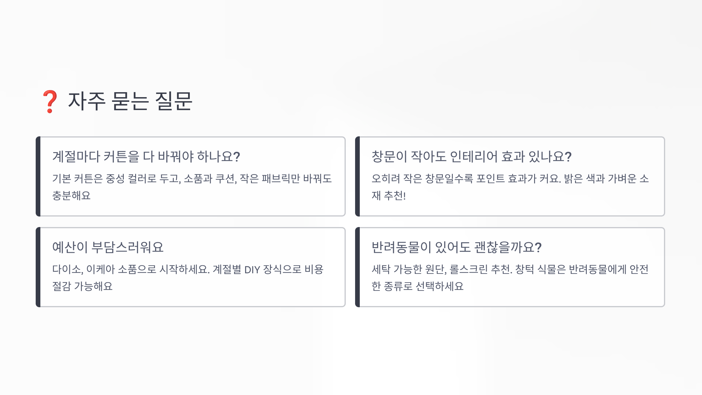 A1. 기본적인 커튼 교체와 소품 구입으로 5-10만 원 정도면 충분해요. DIY를 활용하면 3만 원 이하로도 가능하답니다!