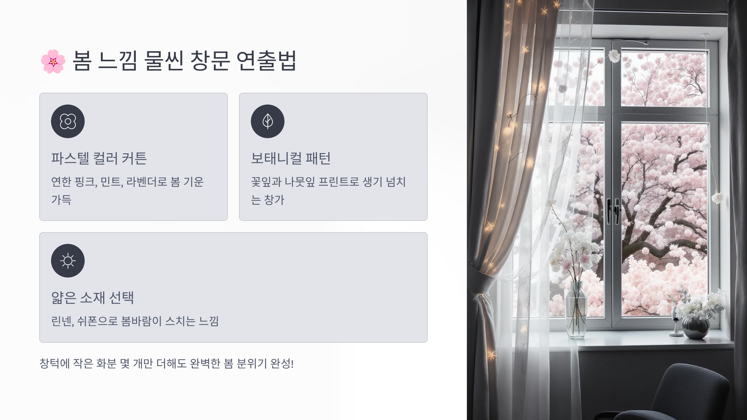 봄은 새로운 시작의 계절이에요. 창문도 봄의 생기와 활력을 담아 꾸며보면 어떨까요? 파스텔톤 커튼으로 교체하거나 꽃무늬 패브릭을 활용하면 봄 분위기를 한껏 낼 수 있어요. 특히 연한 핑크, 라벤더, 민트 그린 같은 색상은 봄과 정말 잘 어울려요.