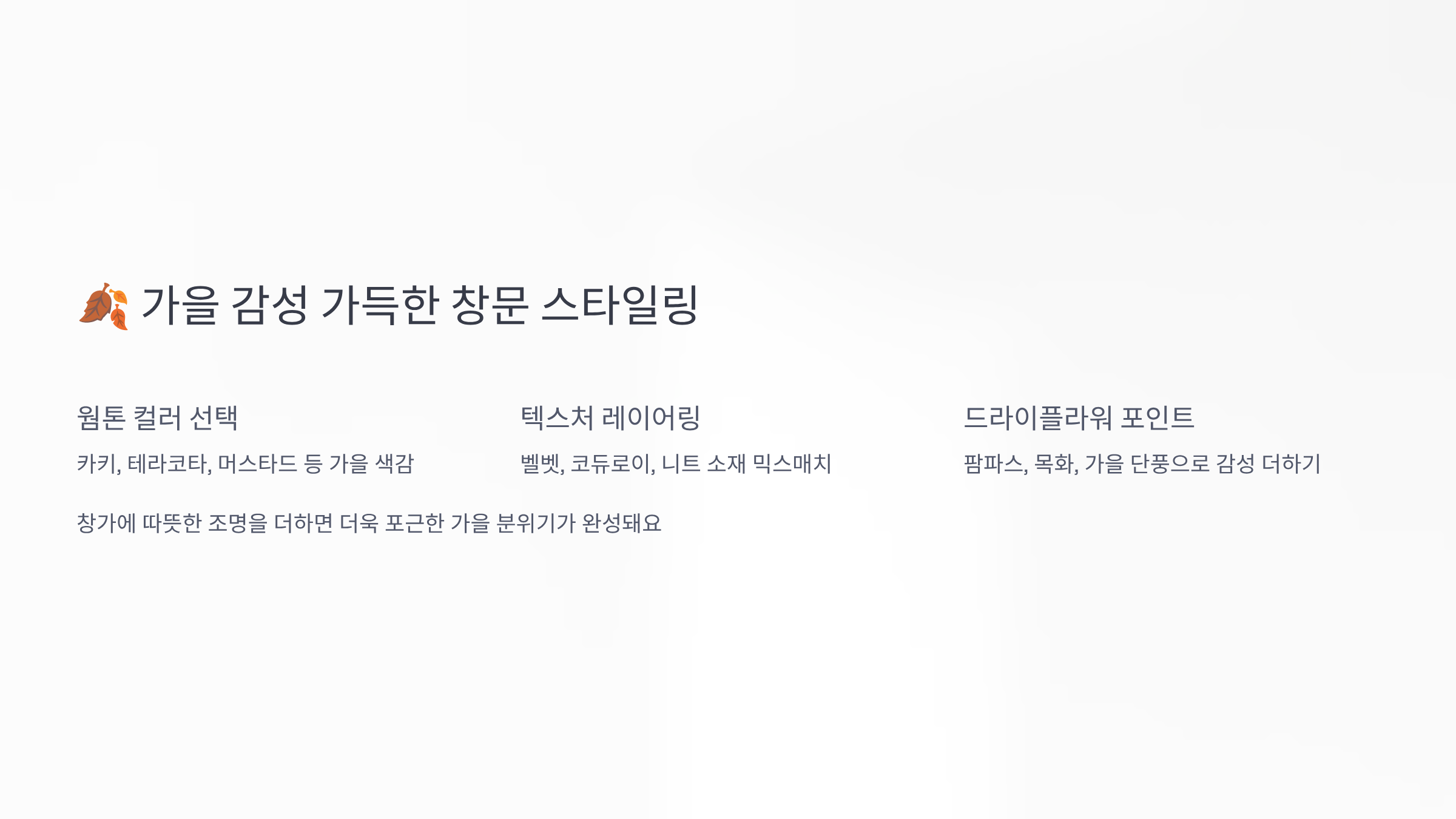 | 창틀 데코 | 프레임 역할, 포인트 연출 | 계절 소품으로 장식 |