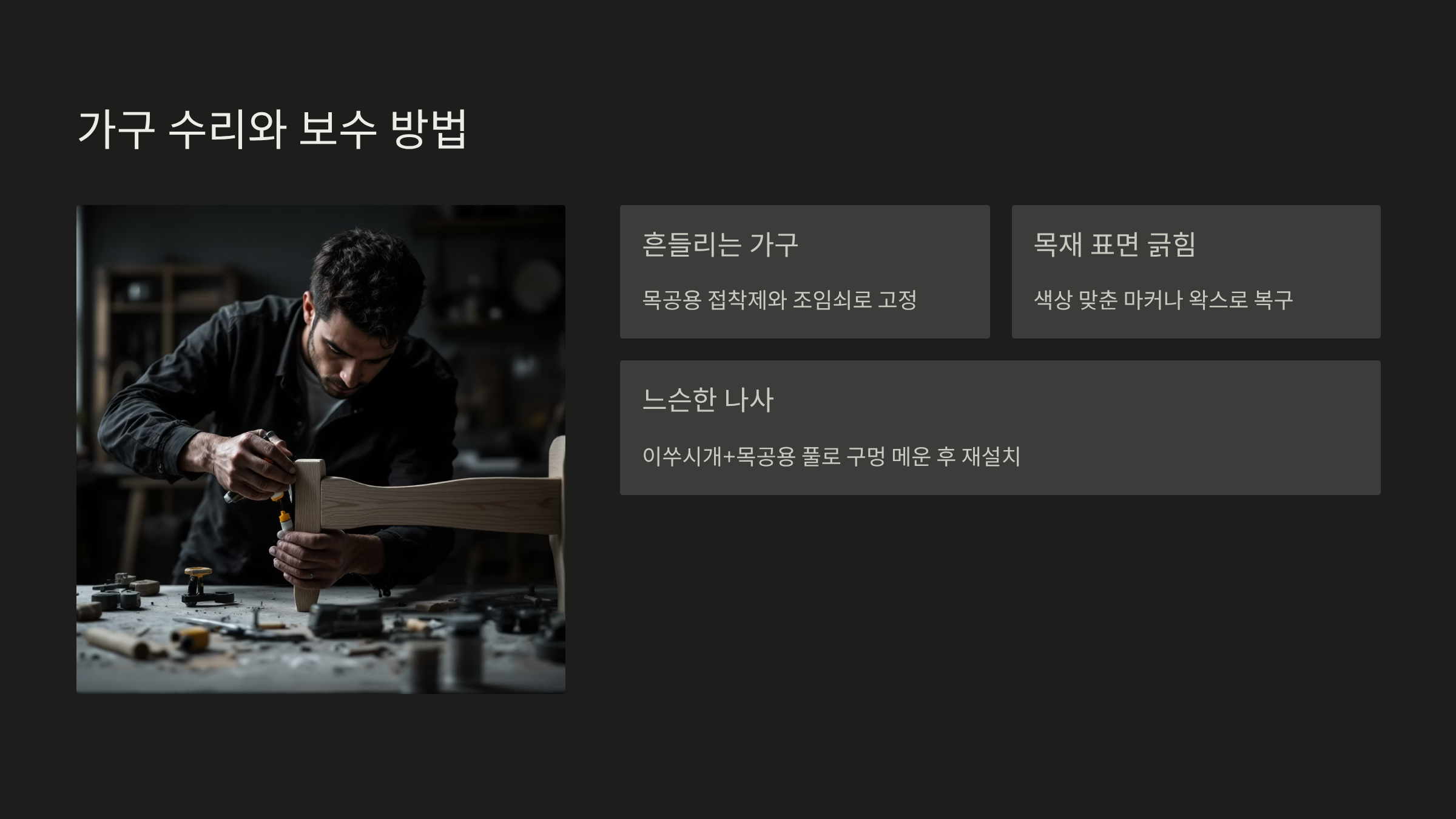 가구가 삐걱거리거나 흔들릴 때 새로 사기보다는 먼저 수리해 보세요. 대부분의 가구 문제는 나사 조임이나 본드 작업으로 해결할 수 있어요. 특히 조립 가구는 시간이 지나면 헐거워지기 마련인데, 정기적으로 점검하고 조여주면 오래 쓸 수 있답니다! 🪑