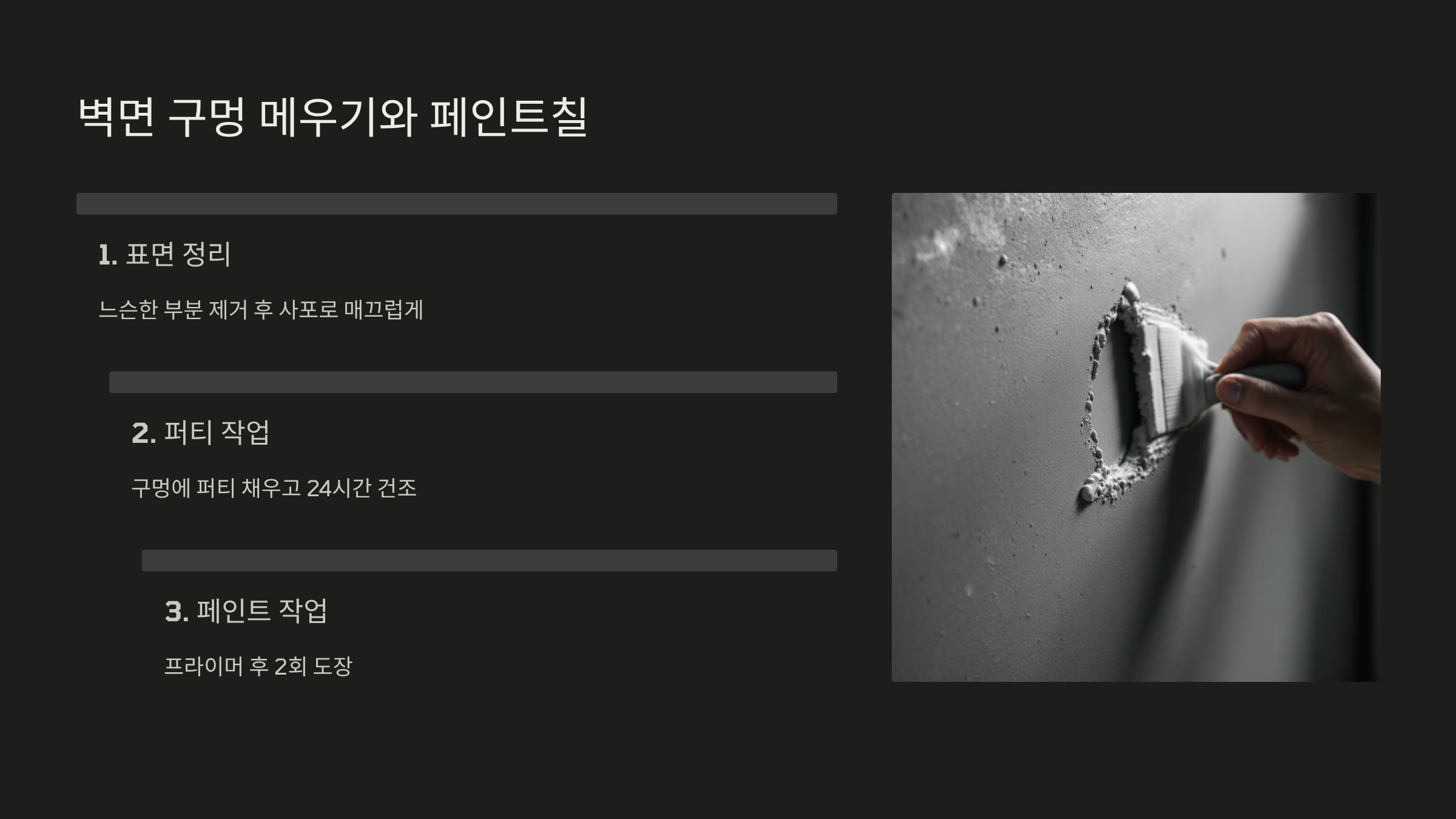 벽에 난 못구멍이나 작은 균열은 생각보다 쉽게 메울 수 있어요. 저도 이사 갈 때마다 벽 구멍 때문에 보증금 깎일까 봐 걱정했는데, 이제는 혼자서도 깔끔하게 처리해요. 못구멍 정도는 10분이면 충분하고, 큰 구멍도 30분이면 해결 가능해요! 🎨