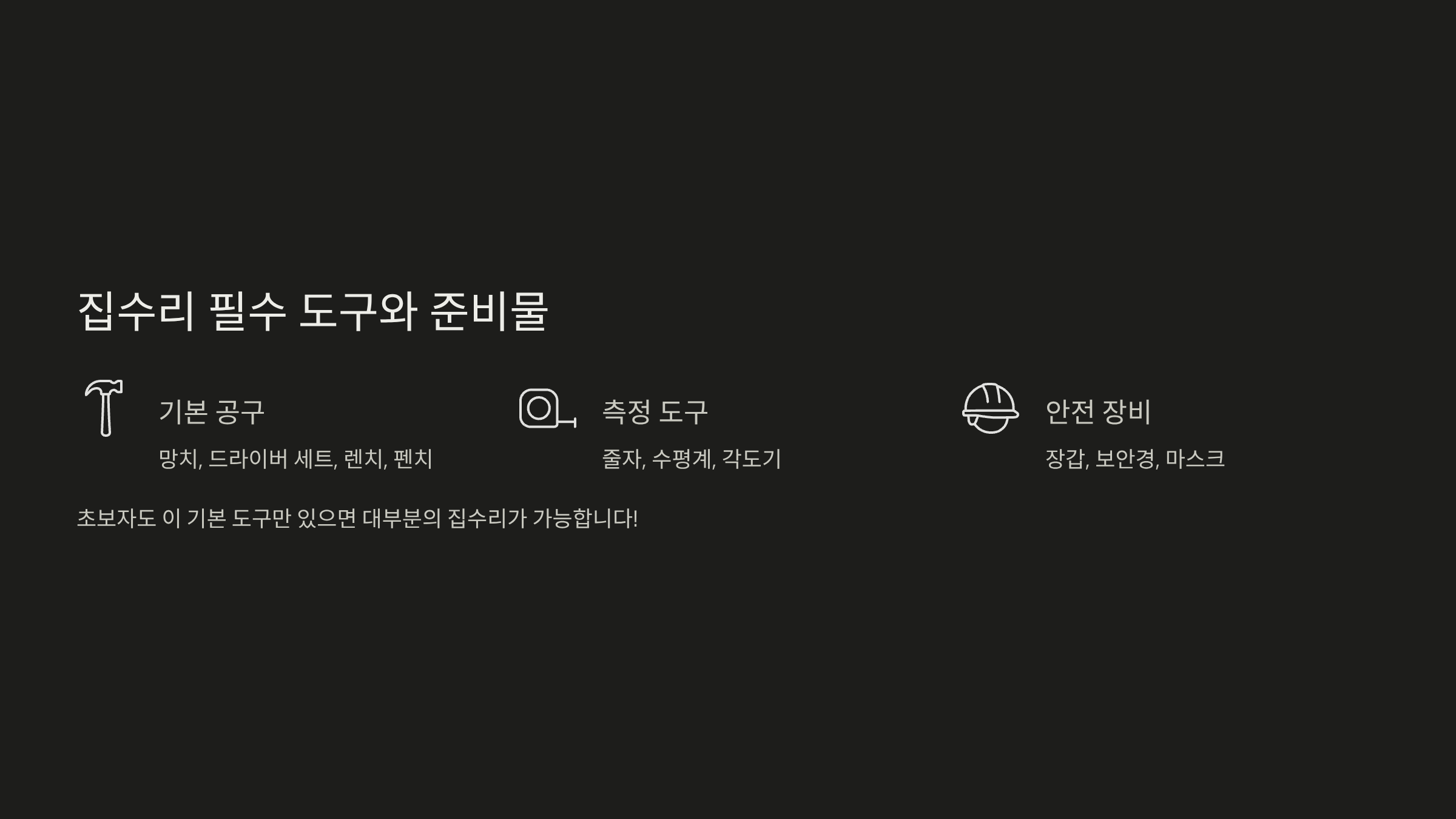 ⚠️ 면책조항: 이 글의 내용은 일반적인 정보 제공 목적으로 작성되었으며, 전문적인 조언을 대체할 수 없습니다. 집수리 작업 시 안전을 최우선으로 하시고, 복잡하거나 위험한 작업은 반드시 전문가에게 의뢰하세요. 작업 중 발생하는 사고나 손상에 대해 저자는 책임지지 않습니다.