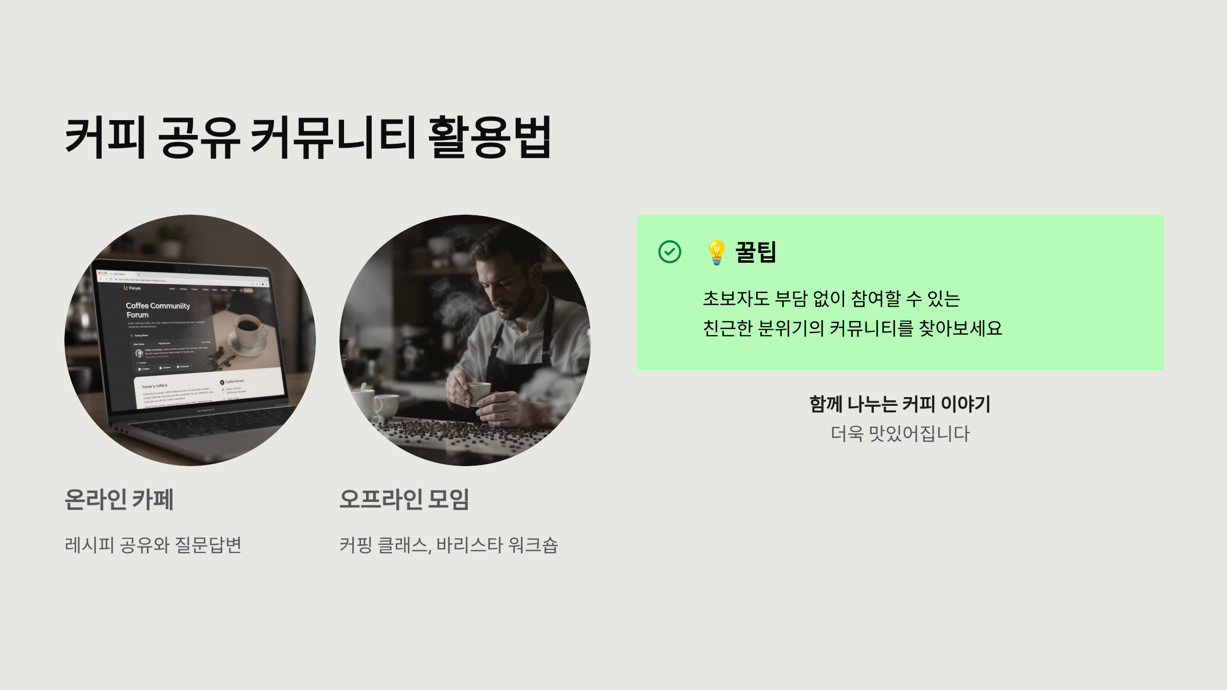 원두 리뷰와 카페 추천도 유용해요. 새로운 원두를 사기 전에 다른 사람들의 평가를 참고할 수 있고, 숨은 맛집 카페 정보도 얻을 수 있어요. 지역별로 정리된 카페 지도를 만들어 공유하는 커뮤니티도 있답니다.