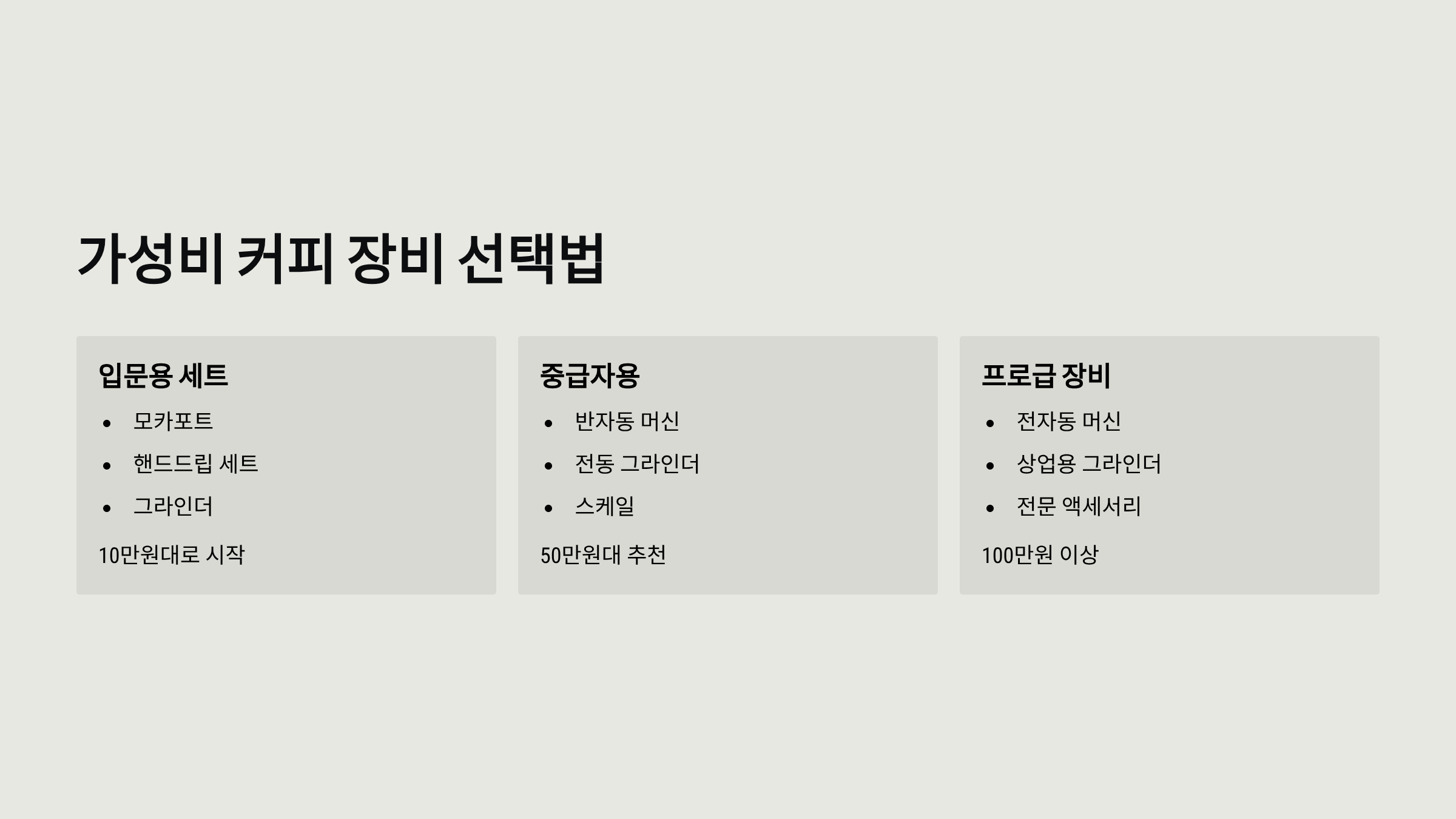 그라인더는 커피 맛을 좌우하는 핵심 장비예요. 수동 그라인더는 2~3만 원대부터 있고, 전동은 5만 원대부터 시작해요. 타임모어 C2나 하리오 미니슬림 같은 입문용 제품들이 가성비가 좋답니다. 매일 사용한다면 전동 그라인더가 편하지만, 가끔 마신다면 수동으로도 충분해요.