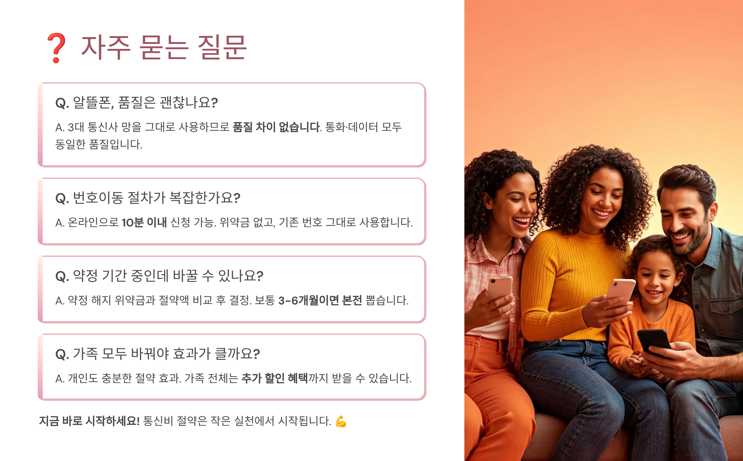 알뜰폰으로 전환하면 통화품질 동일, 요금은 절반으로 줄일 수 있어요. 매달 3~5만 원 절약은 기본이고, 가족 결합까지 활용하면 월 10만 원 이상도 아낄 수 있어요.