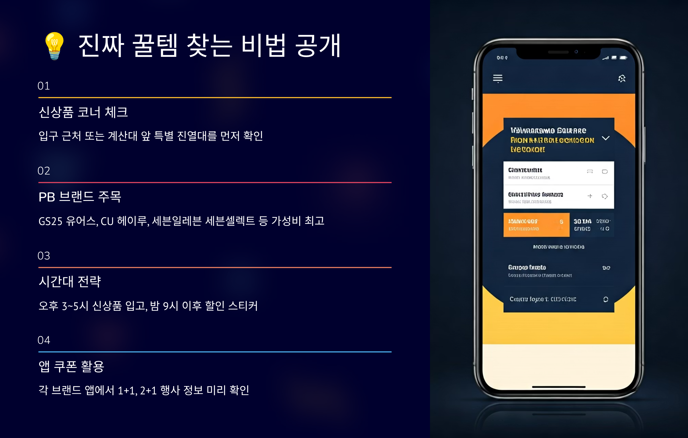 두 번째 비법은 앱 활용이에요. CU의 포켓 CU, GS25의 나만의 냉장고, 세븐일레븐의 세븐앱 등 각 브랜드 공식 앱에는 숨겨진 혜택이 가득해요. 매월 생일 쿠폰, 신규 가입 혜택, 포인트 적립, 예약 구매 기능까지 스마트하게 활용하면 같은 상품도 훨씬 저렴하게 구매할 수 있답니다.