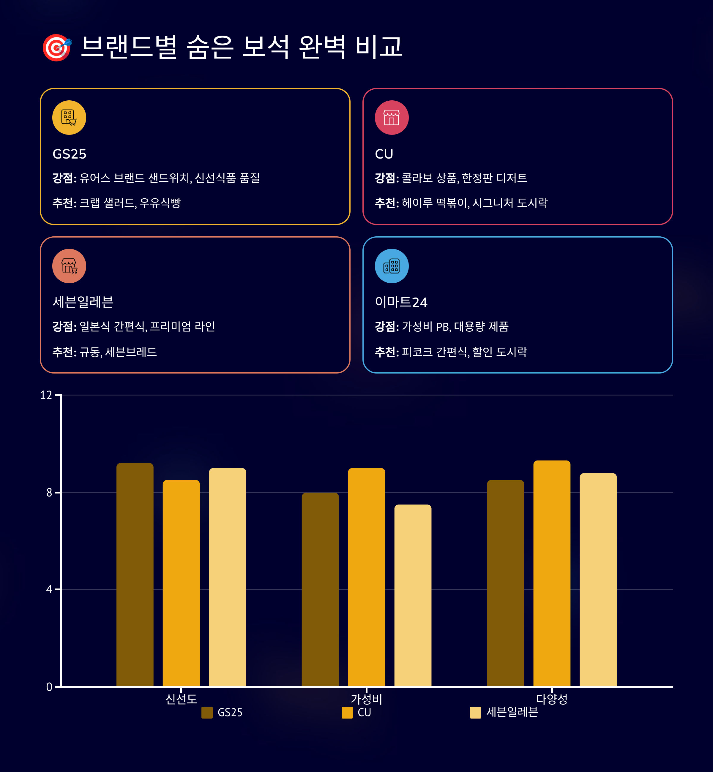 브랜드 충성도의 함정에 빠지는 것도 문제예요. 집 앞 편의점이 CU라면 CU만 가게 되고, GS25 상품은 경험해 볼 기회가 없어지잖아요. 하지만 각 브랜드마다 강점이 다르기 때문에 한 브랜드만 고집하면 좋은 상품을 놓치게 되는 경우가 많답니다.