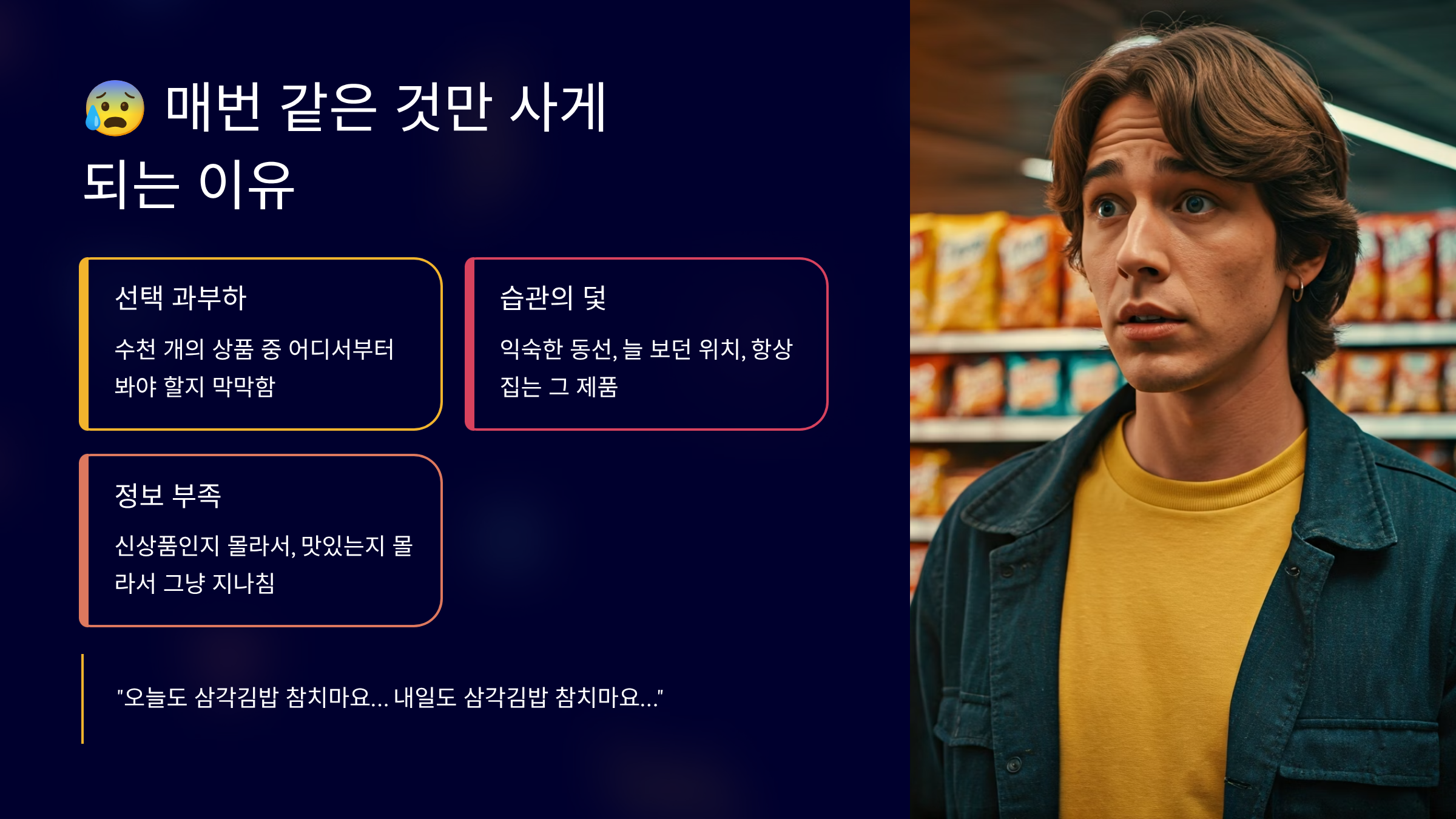 시간 압박도 큰 문제예요. 출근길이나 점심시간에 급하게 들르다 보니 천천히 둘러볼 여유가 없잖아요. 그래서 눈에 보이는 것, 손에 익은 것만 집어 들게 되는 거예요. 이런 패턴이 반복되면서 편의점은 그저 급할 때 가는 곳이라는 인식이 굳어지게 된답니다.