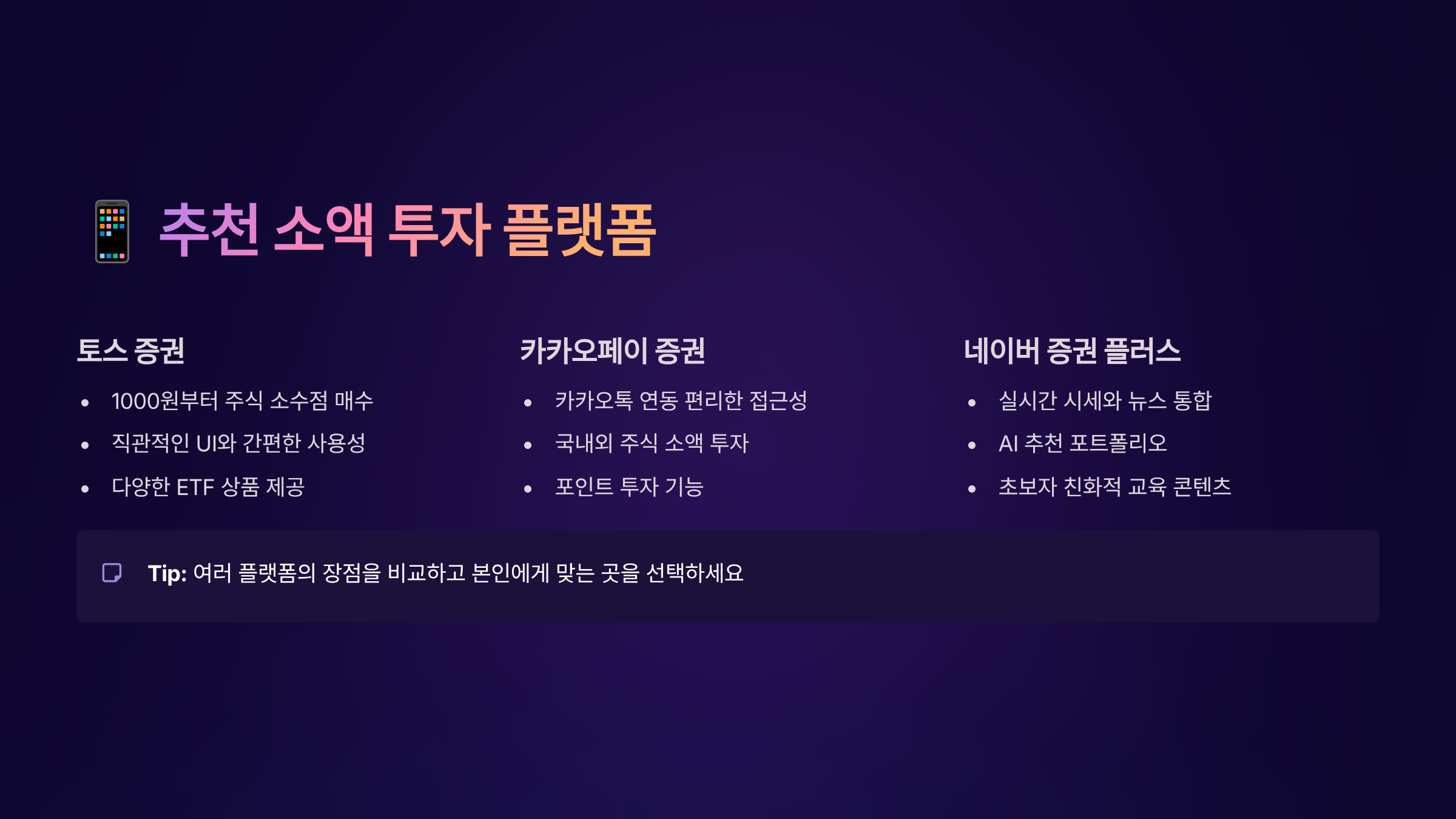 소액 투자를 시작하려면 먼저 좋은 플랫폼을 선택해야 해요. 토스, 카카오페이, 네이버페이 같은 간편 결제 앱들이 투자 서비스를 제공하면서 진입 장벽이 크게 낮아졌어요. 토스의 경우 주식, 펀드, 채권까지 다양한 상품을 1000원부터 투자할 수 있고, 수수료도 저렴해요. 특히 토스증권은 국내 주식 거래 수수료가 평생 무료라는 큰 장점이 있답니다. 사용자 인터페이스도 직관적이어서 투자 초보자들이 쉽게 시작할 수 있어요.