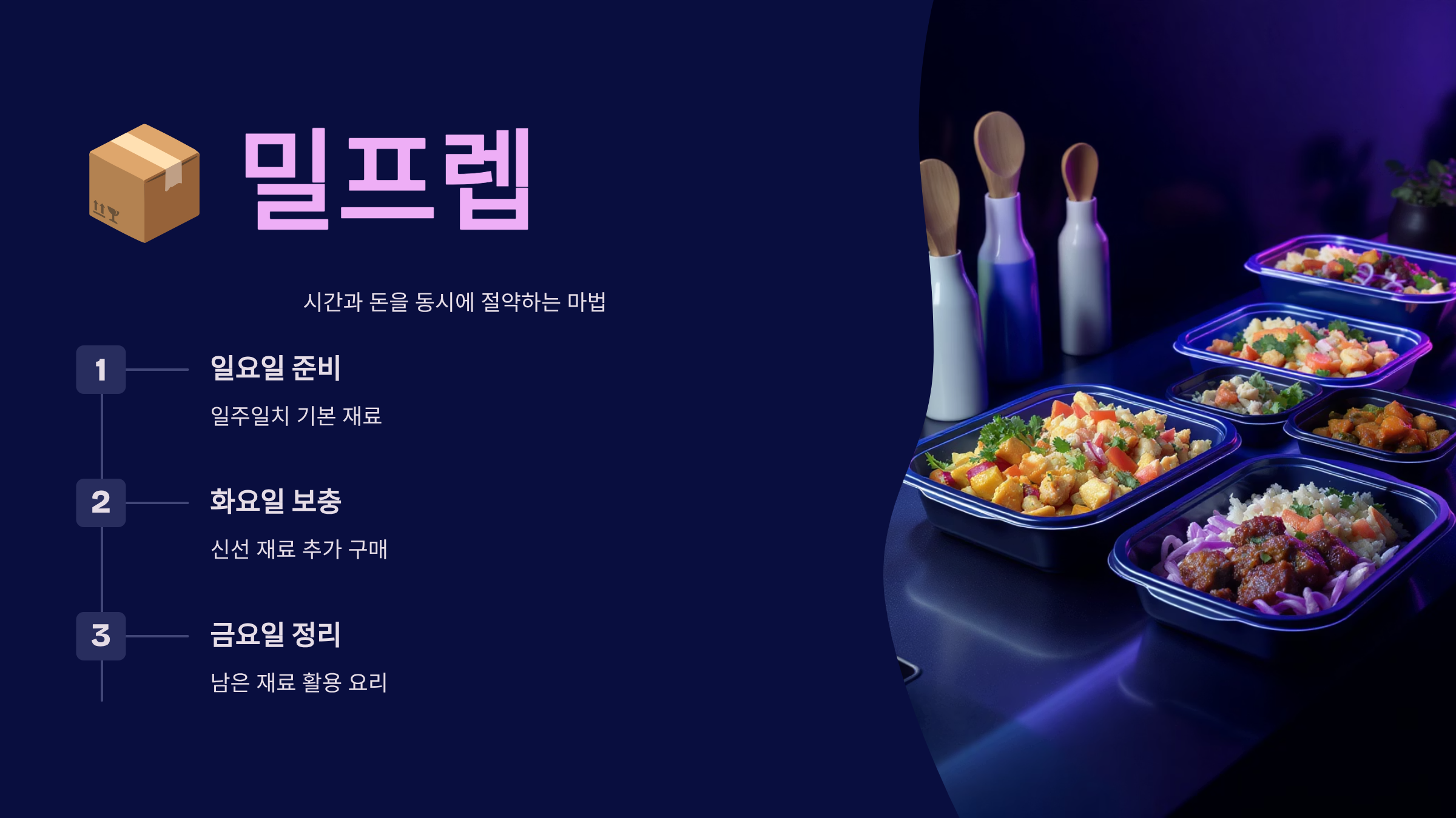 밀프렙(Meal Prep)은 일주일치 식사를 미리 준비하는 방법이에요. 매주 일요일 3시간을 투자해 5일 치 도시락을 만들었답니다. 현미밥, 닭가슴살, 브로콜리를 기본으로 하고 매일 다른 소스를 곁들였어요. 한 끼당 3,500원으로 영양 만점 도시락을 먹을 수 있었죠. 편의점 도시락 대비 60% 절약이에요.