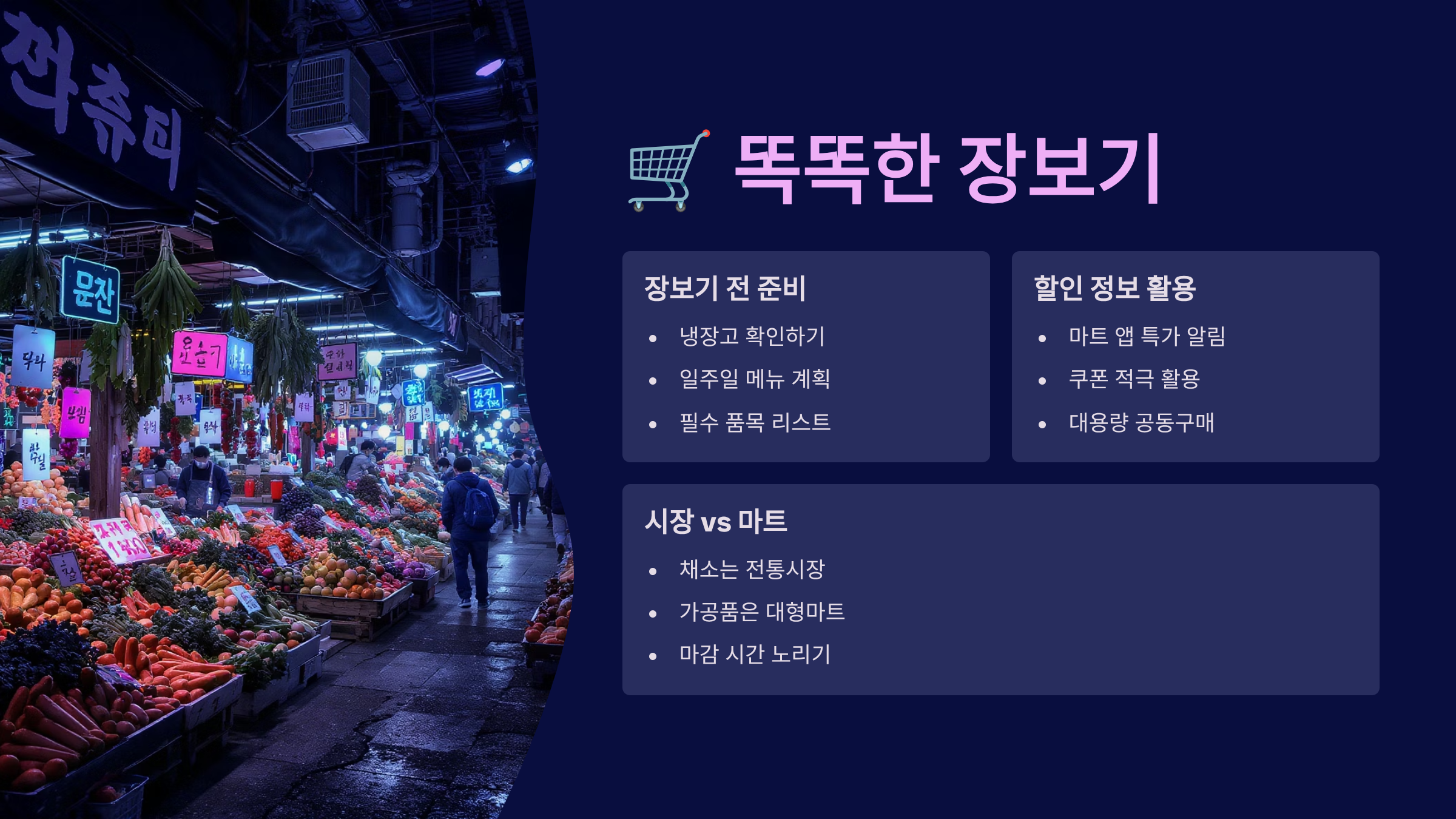 장보기 시간대를 전략적으로 선택하는 것부터 시작했어요. 대형마트는 평일 오전 10-11시, 재래시장은 장 마감 1시간 전이 최적의 시간이에요. 이 시간대에는 할인 행사가 많고, 특히 시장에서는 떨이 판매로 신선한 재료를 저렴하게 구입할 수 있답니다. 실제로 오후 5시 이후 시장에서는 채소류를 30-50% 할인된 가격에 살 수 있었어요.