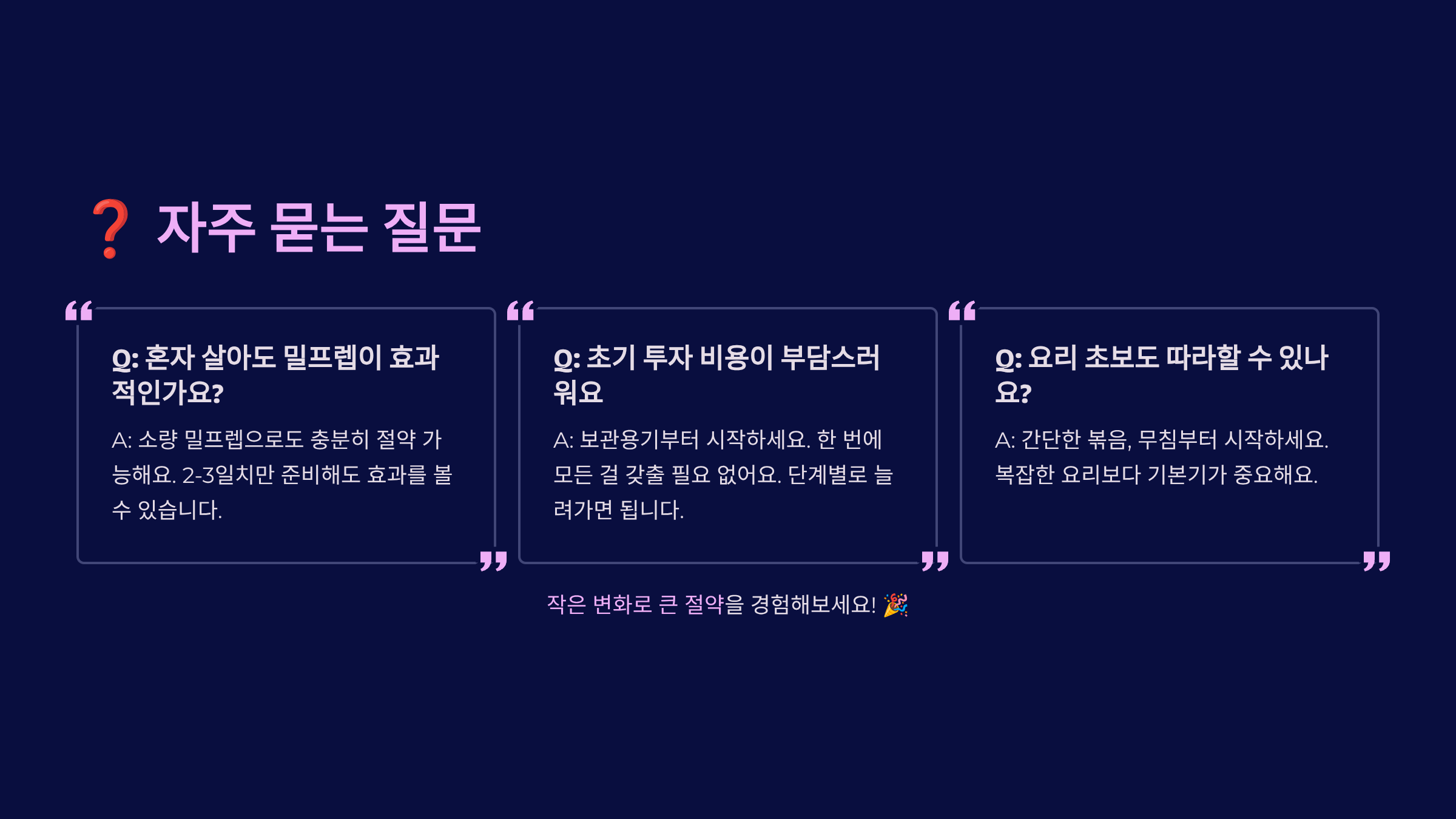 A2. 밀프렙과 배치 쿠킹으로 주 2-3회만 요리해도 충분해요! 주말에 3시간 투자해서 일주일치 식사를 준비하면 평일엔 데우기만 하면 됩니다. 원팟 요리나 전기밥솥 요리를 활용하면 더욱 간편해요. 처음 한 달만 적응하면 오히려 시간이 절약된답니다.