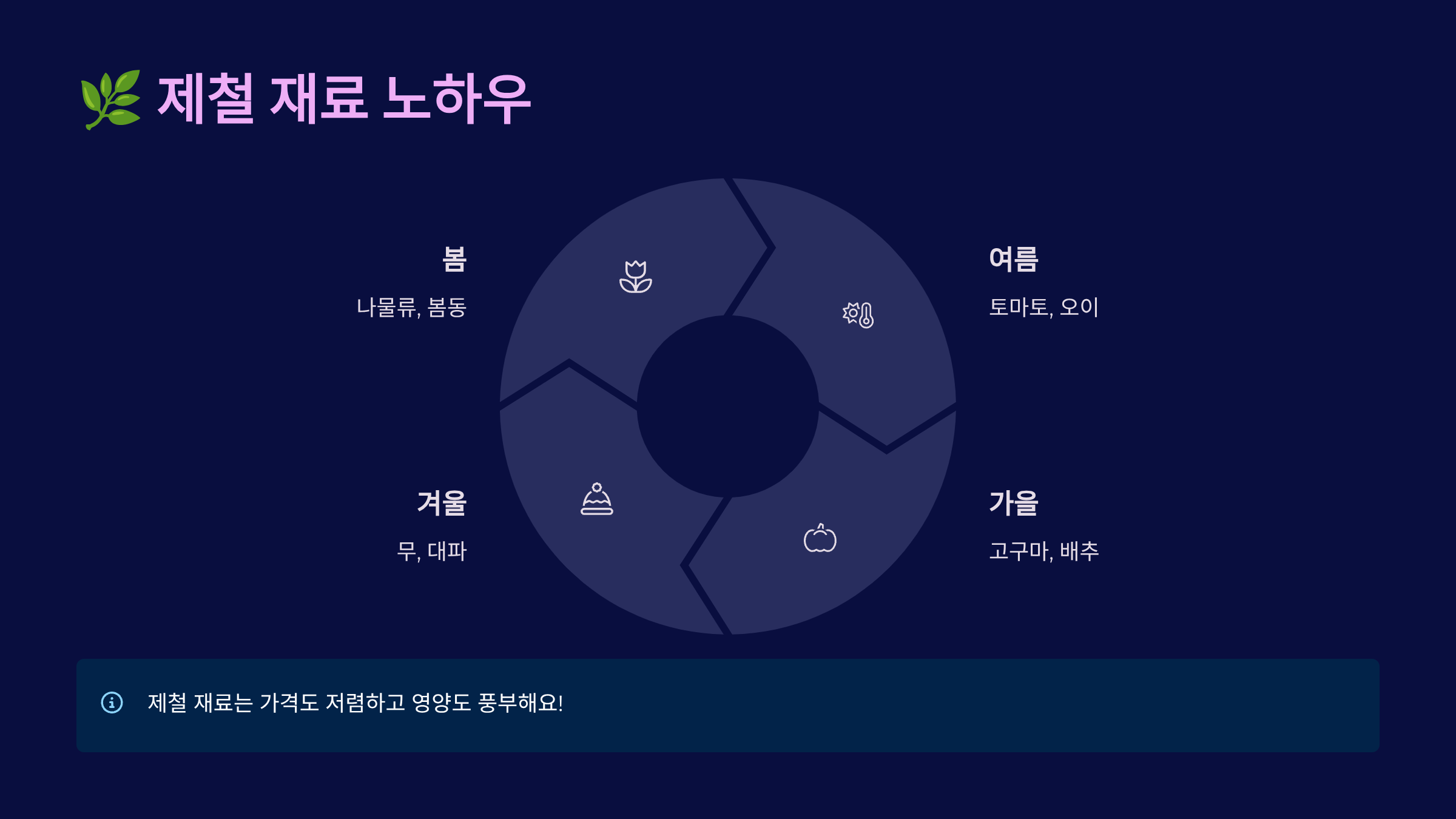 | 계절 | 주요 재료 | 활용법 | 보관 기간 |