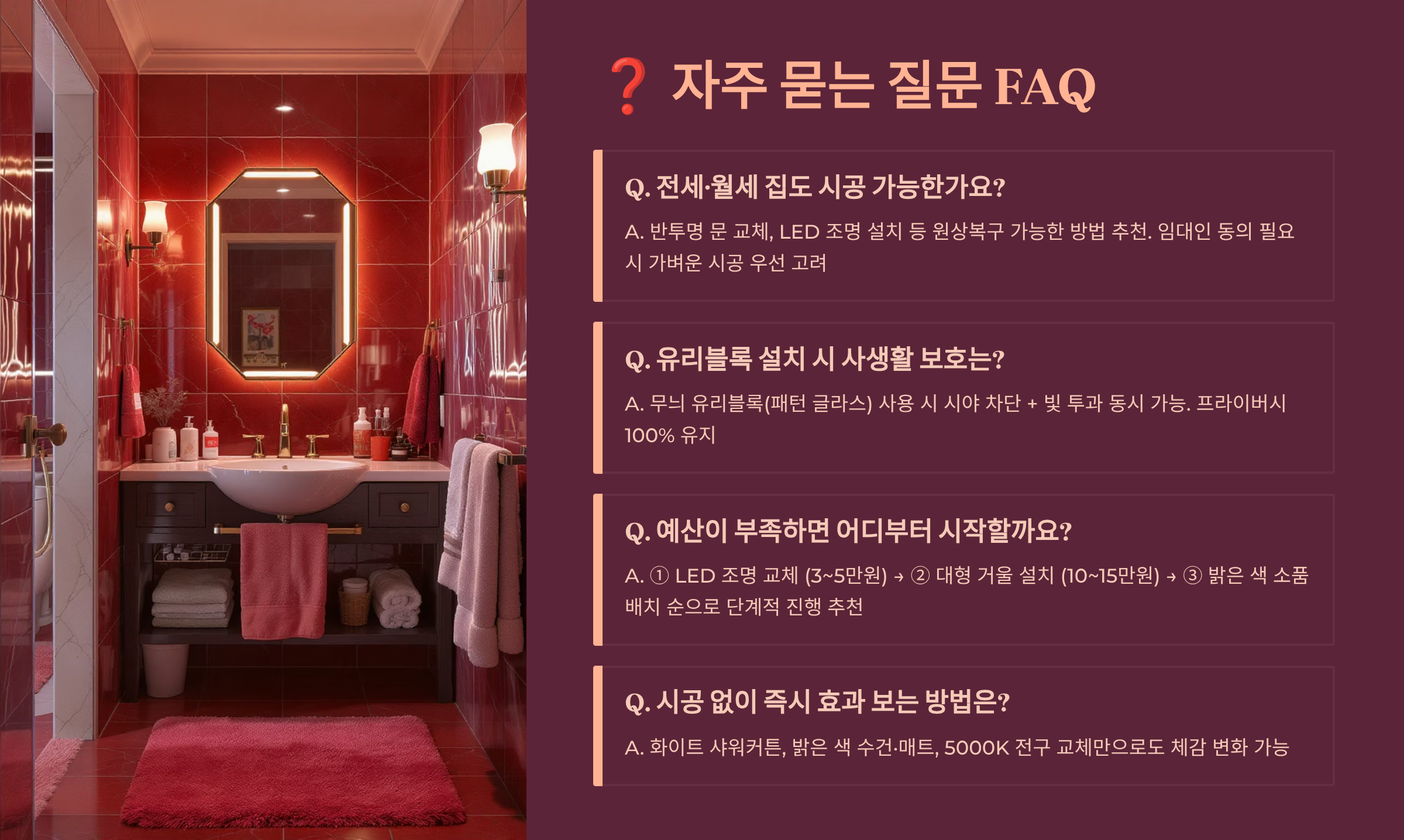 A3. 네, 가능해요! 원상복구가 가능한 방법들이 많아요. LED 전구 교체, 거울 부착, 타일 시트지, 이동식 조명 등은 퇴거 시 제거할 수 있답니다. 집주인과 협의하면 비용을 분담하거나 월세를 깎아주는 경우도 있어요.
