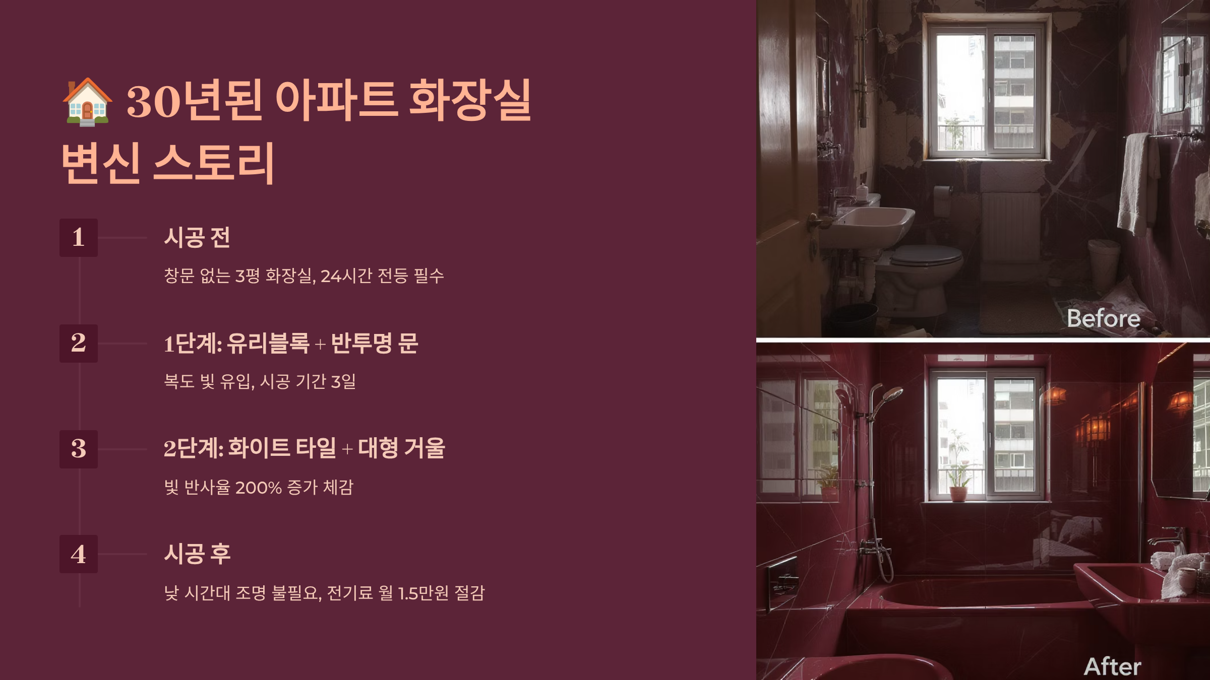 강남구 A아파트 김 모 씨(42세) 사례를 소개할게요. 25평 아파트 안방 화장실이 북향이라 낮에도 전등을 켜야 했대요. 유리블록 6개 설치와 LED 거울 교체, 밝은 타일 시트지 작업으로 총 45만 원을 투자했어요. 결과는 놀라웠답니다! 전기료가 월 8,000원 절감되고, 곰팡이 제거제 구입비가 없어졌어요. 무엇보다 아침마다 기분이 좋아졌다고 해요.