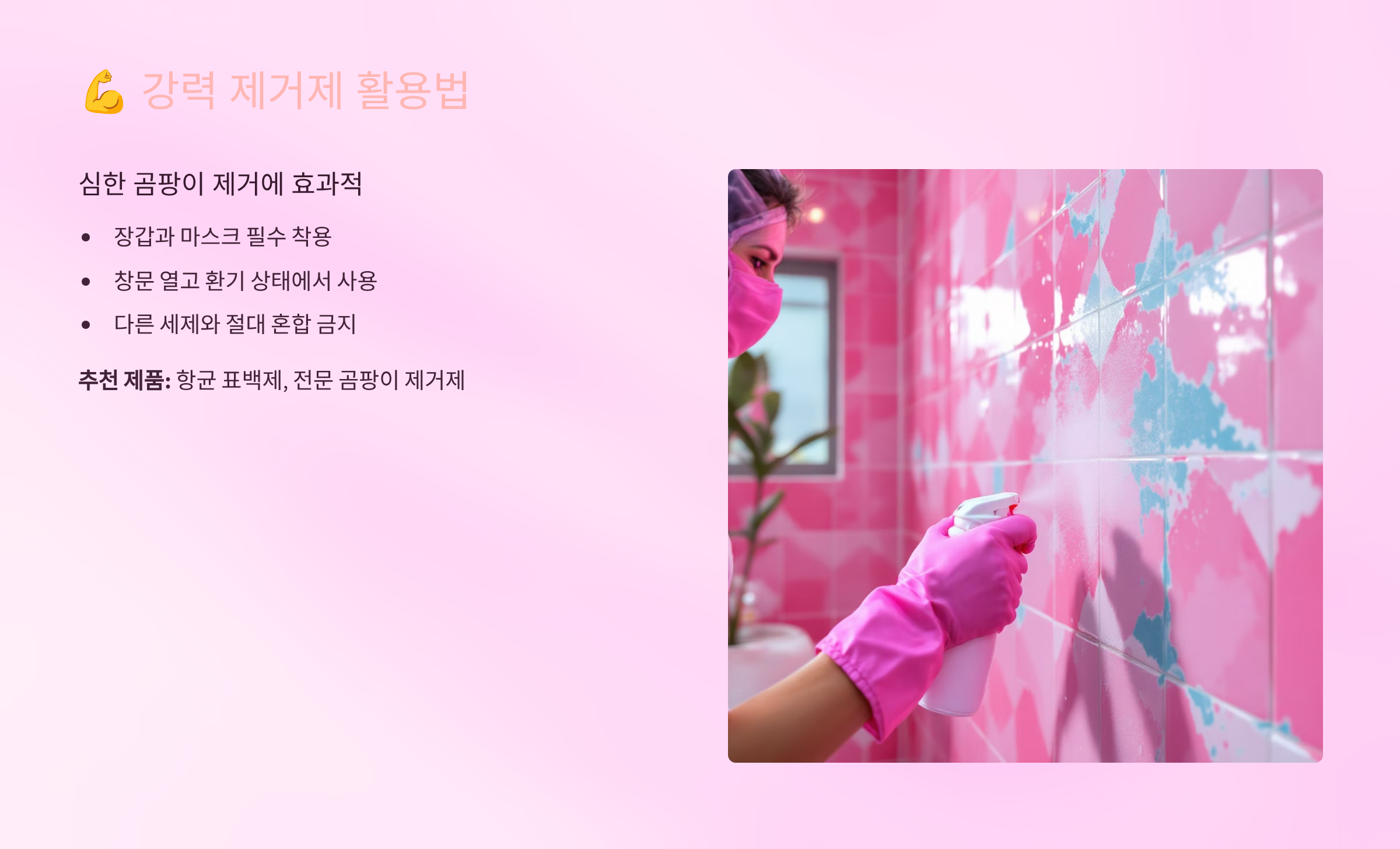 | 전문 곰팡이제 | 4급 암모늄 | 5-15분 | 장갑 착용, 피부 보호 |