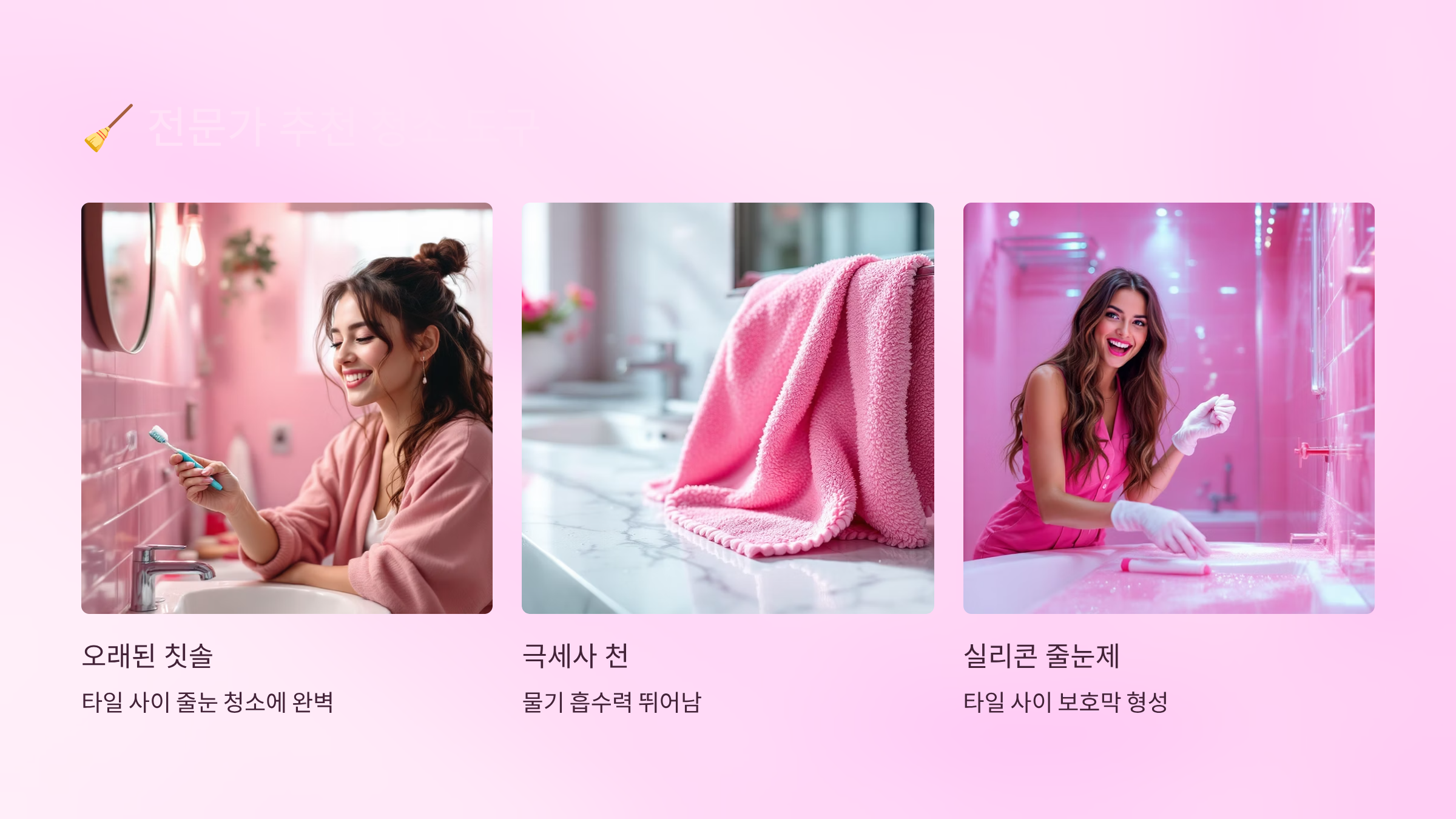 | 타일 줄눈 | ⚠️ 매우 높음 | 물기 잔류, 다공성 재질 |