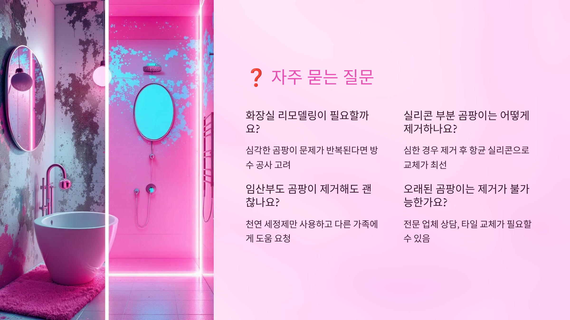 A7. 욕실 크기와 곰팡이 정도에 따라 다르지만, 일반적으로 20-50만 원 선이에요. 단순 제거만 하면 저렴하지만, 방수 코팅이나 실리콘 재시공까지 포함하면 비용이 올라가요. 여러 업체 견적을 비교하고, 사후 관리 서비스가 포함되는지 확인하세요. 정기 관리 계약을 하면 할인받을 수 있어요.