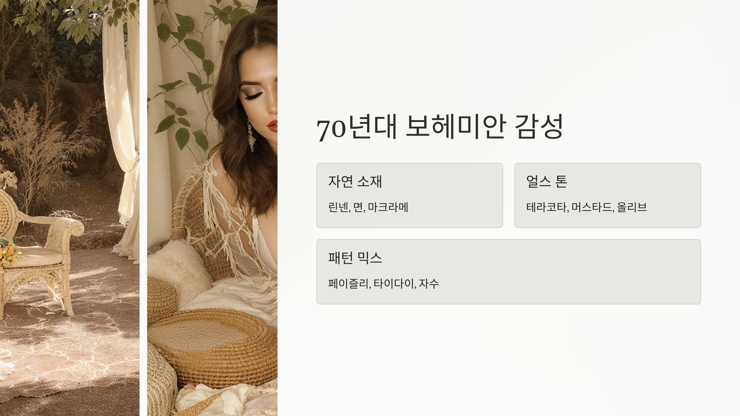 보헤미안 스타일의 핵심은 레이어링이에요. 다양한 텍스처와 패턴을 믹스해도 자연스러운 것이 매력이랍니다. 플로럴 프린트 맥시 드레스에 데님 재킷을 걸치거나, 크로셰 베스트에 와이드 팬츠를 매치하는 식이에요. 컬러는 브라운, 베이지, 테라코타 같은 따뜻한 톤이 주를 이루고, 포인트로 터쿼이즈나 버건디를 활용해요.