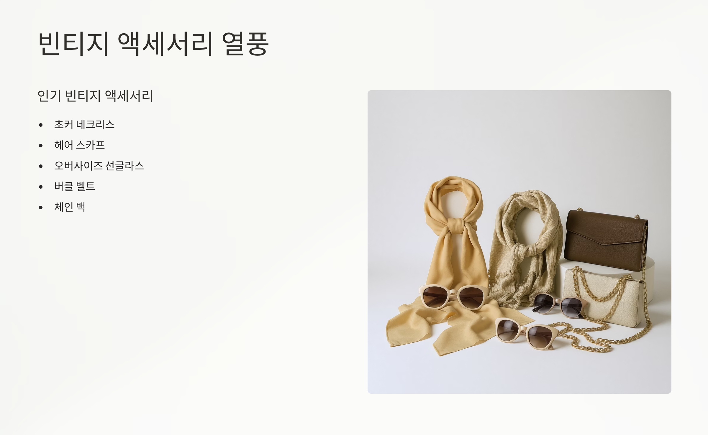 빈티지 액세서리는 패션의 완성이에요. 심플한 의상도 특별한 빈티지 피스 하나로 완전히 다른 느낌을 줄 수 있답니다. 2025년에는 빈티지와 현대적 아이템을 믹스하는 하이브리드 스타일링이 트렌드예요. 나만의 시그니처 빈티지 액세서리를 찾아 특별한 스타일을 완성해 보세요! ✨