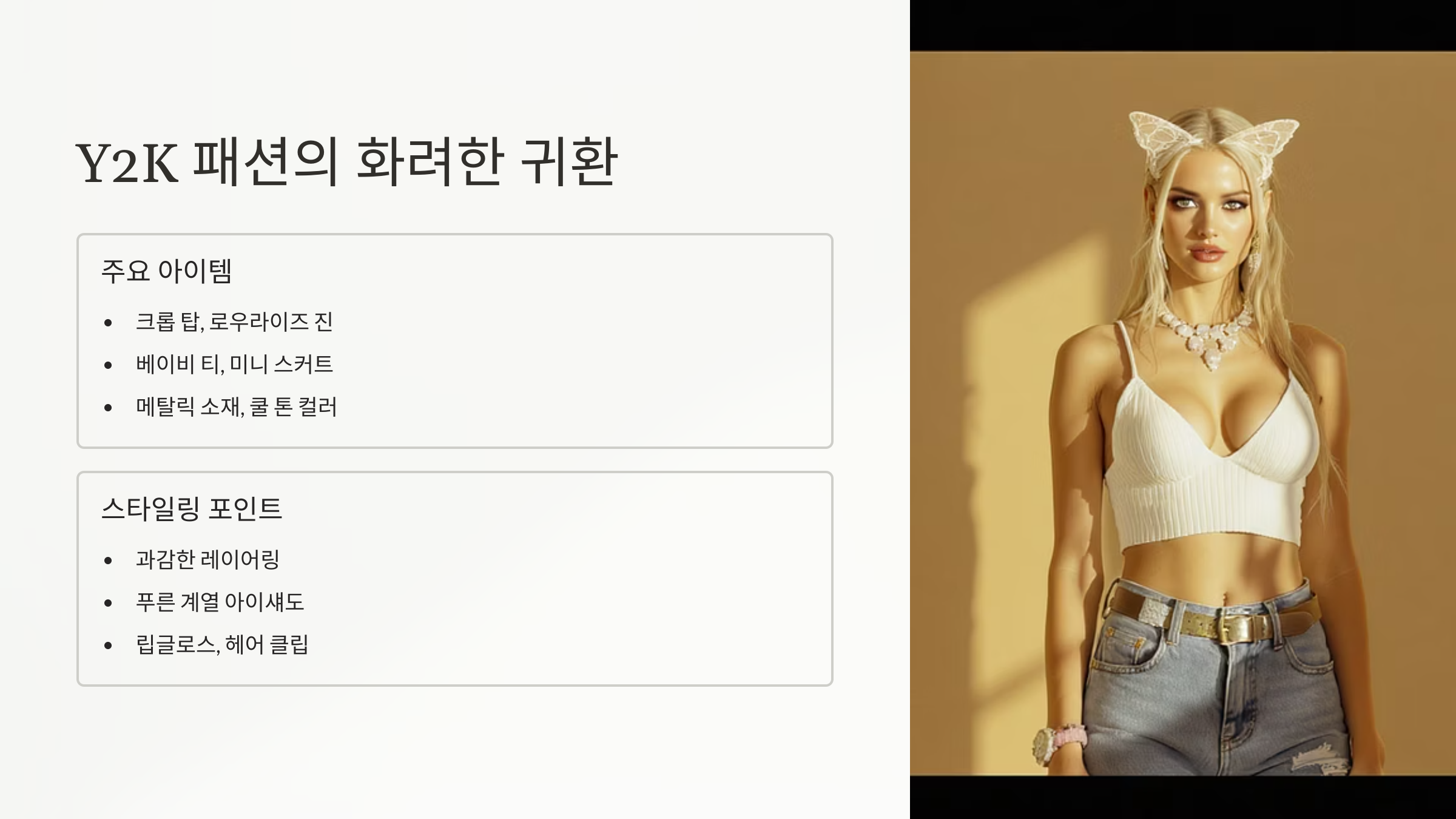 Y2K 패션이 2025년 가장 핫한 레트로 트렌드로 자리 잡았어요. 2000년대 초반의 테크노 퓨처리즘과 팝 문화가 결합된 이 스타일은 MZ세대에게 새로운 놀이터가 되고 있답니다. 메탈릭 소재, 홀로그램 원단, 네온 컬러가 대표적인 특징이에요. 특히 로우라이즈 진, 카고 팬츠, 미니스커트가 다시 유행하면서 Y2K 열풍이 거세지고 있어요.