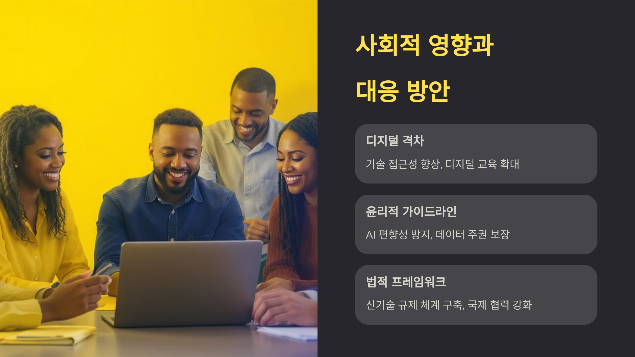 사회적으로는 디지털 격차 해소가 중요한 과제예요. AI 기술의 혜택이 일부 계층에만 집중되지 않도록 하기 위해서는 모든 사람이 기술에 접근할 수 있는 환경을 만들어야 해요. 특히 고령층이나 저소득층에 대한 디지털 교육과 지원이 필요해요.