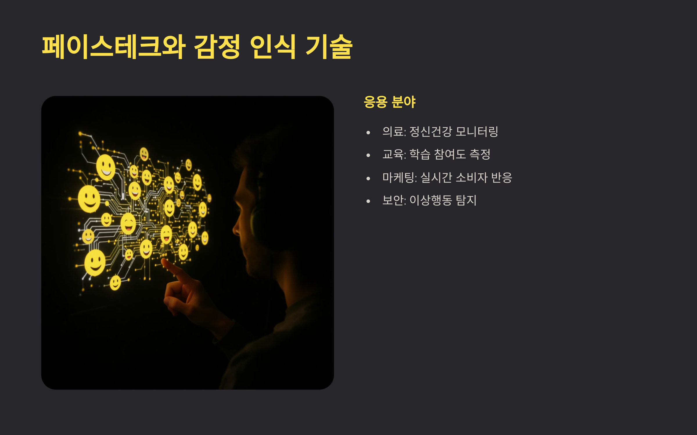 2025년 가장 혁신적인 기술 중 하나는 바로 '페이스테크'예요. 이는 얼굴 인식 기술을 넘어서 사람의 감정까지 읽어내는 기술을 의미해요. 이제 컴퓨터나 스마트폰이 우리의 표정을 분석해서 기분을 파악하고, 그에 맞는 서비스를 제공할 수 있게 되었답니다. 정말 SF 영화에서나 볼 수 있었던 기술이 현실이 된 거예요!