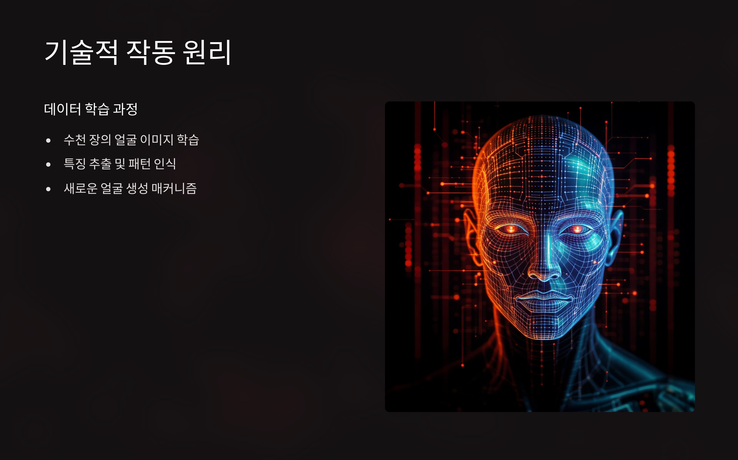 이 기술의 핵심은 '특징 추출'과 '재구성'이에요. AI는 먼저 수많은 얼굴 이미지에서 눈, 코, 입 등의 특징을 추출하고 패턴을 학습해요. 그다음 이러한 특징들을 새롭게 조합하여 전혀 새로운 얼굴을 만들어내는 거죠. 마치 레고 블록을 조립하듯이 얼굴의 각 부분을 조합하는 것과 비슷하다고 볼 수 있어요.